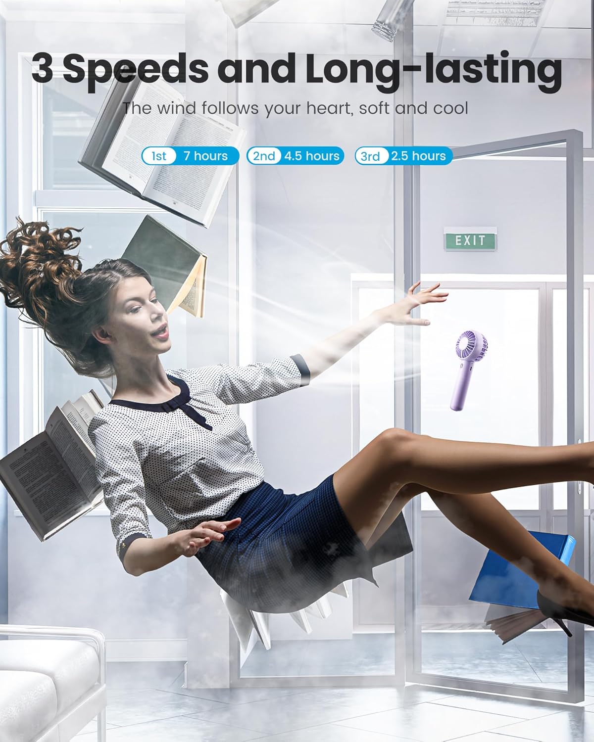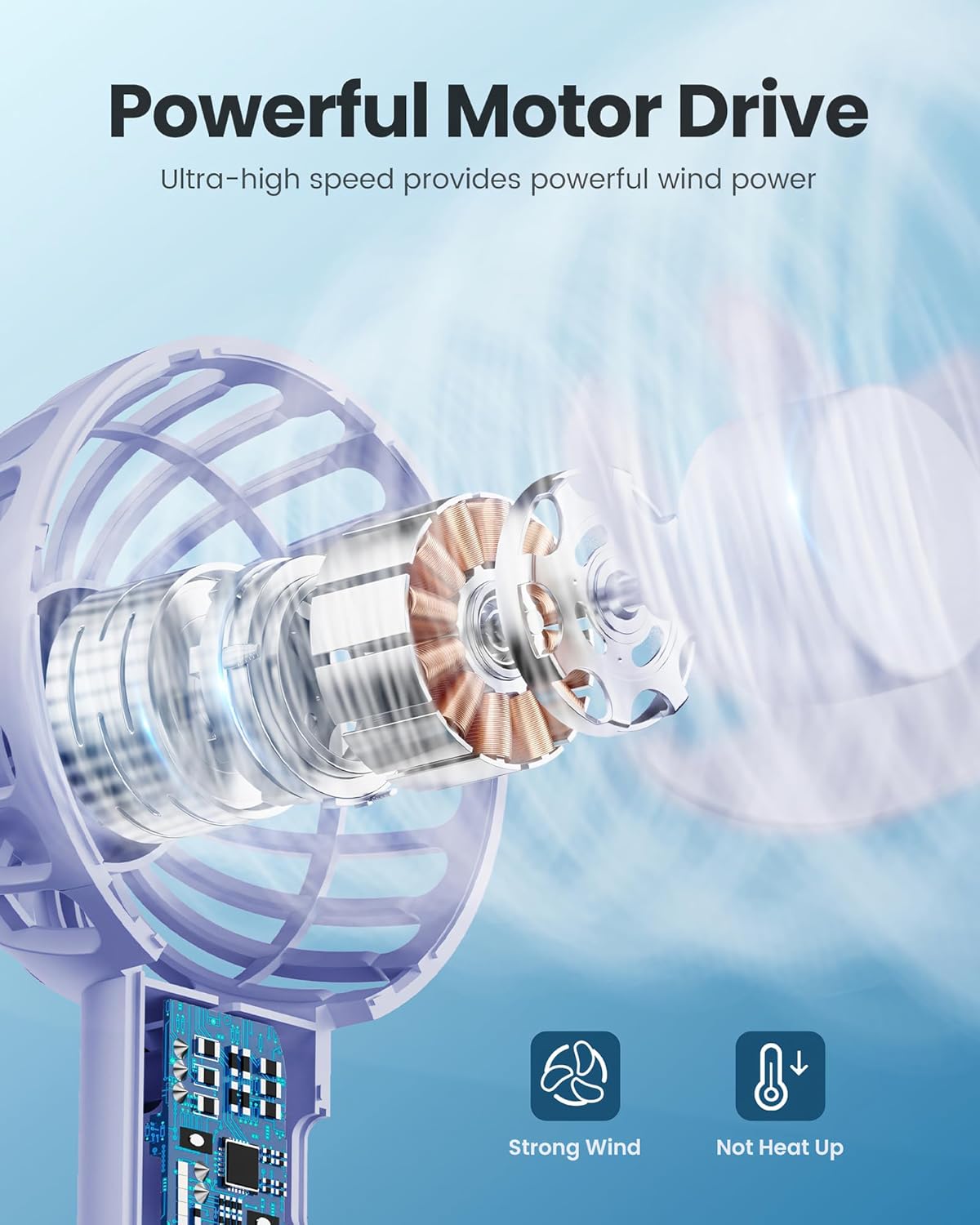 - Powerful wind & 3-speed setting: Built-in powerful brushless motors, which can generate strong wind; The hand fan has 3 adjustable wind speeds, press it for low-speed 3500r/m, medium speed 4500r/m, and high-speed 7500r/m