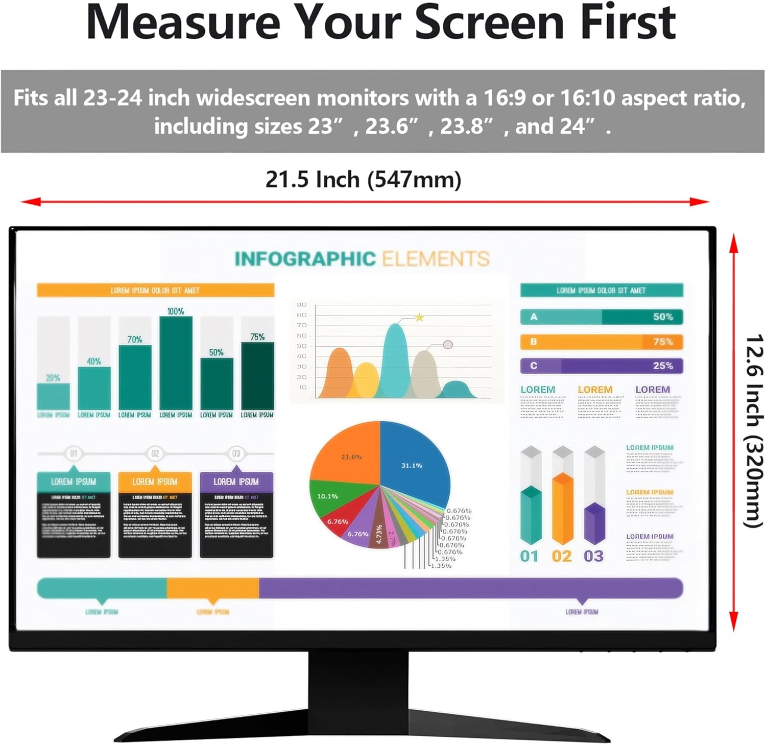 - 【 Privacy Filter Dimensions 】- Privacy Screen Fits 23 inch to 24 inch, 23"-24" widescreen monitors with a 16:9 or 16:10 aspect ratio. Actual Filter Size: Width: 21 1/2" (547mm), Height: 13 3/5" inches (320mm). Compatible with HP Dell Acer Samsung LG ViewSonic and More. The length and width may not be a perfect fit, so the filter may be a little longer and wider.