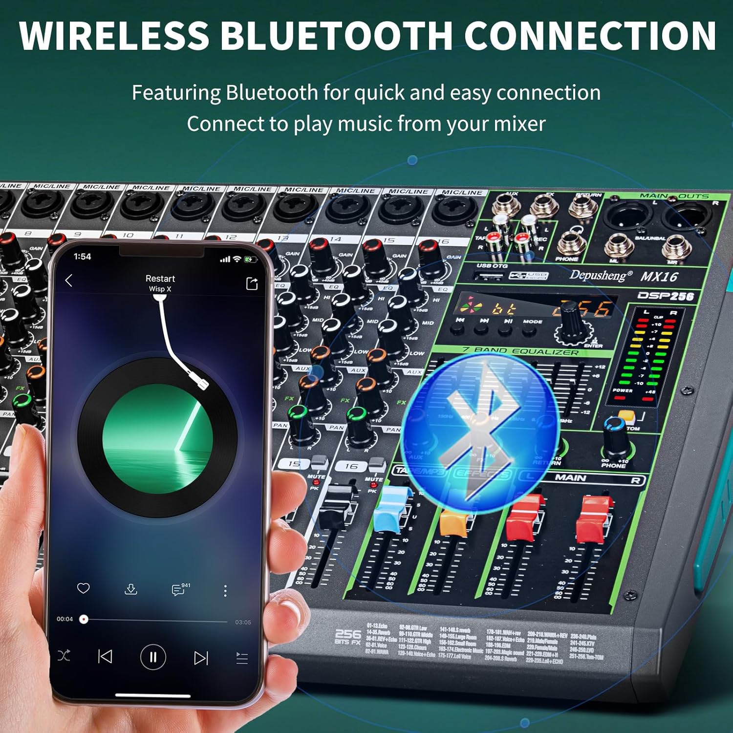 Depusheng MX16 16 Channel Sound Mixer Audio Mixing Console 48V 256DSP Professional USB PC Play Record Podcast Live Broadcast (US MX16)