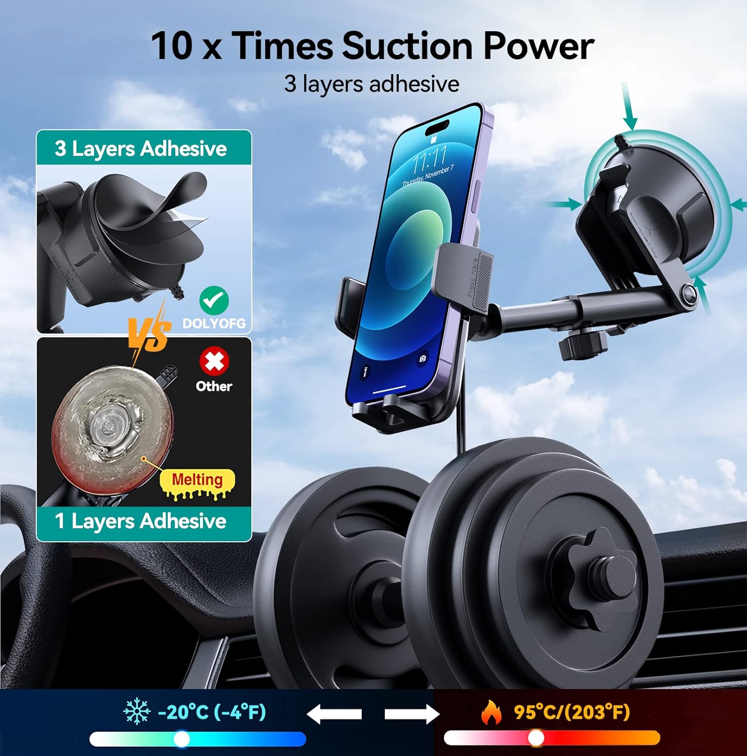 - [ Super Suction + High-Temperature Resistance ] The phone holder for car is made of strong 3-layer adhesive gel and a 1-step locking mechanism that can withstand temperatures from -20°C (-4°F) to 95°C/(203°F) and is tested at high temperatures without falling off; it provides strong suction on smooth surfaces without leaving any residue. The suction cups are washable, so if suction weakens, you can wash and air dry to restore adhesion. The strong suction force ensures that even on rough roads, it will not affect making phone calls, listening to music, and GPS navigation