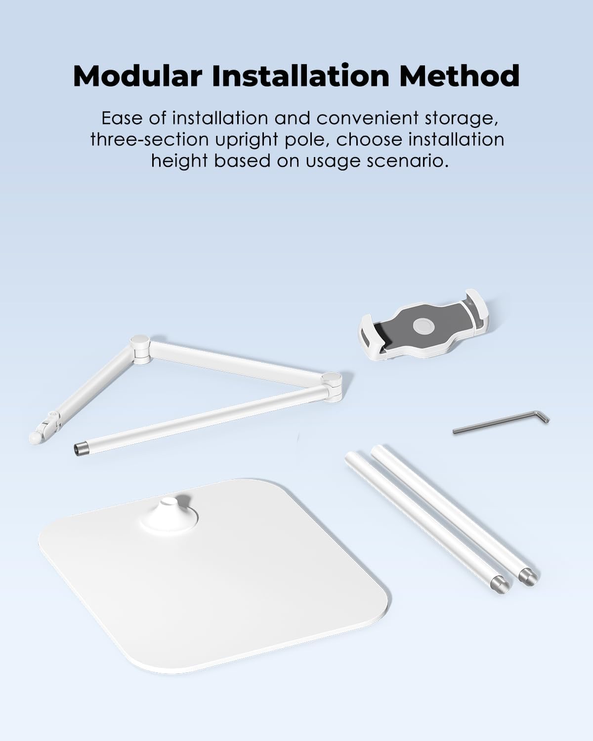 - 【Flexible Angle Adjustment】The tablet holder can rotate 360 degree, easily adjust your device to the most comfortable position. Press the silver magnetic cover at the joint to remove it, and use a wrench to adjust the tension for supporting heavier devices. Ensuring that your equipment is stable and will not fall. The stable stand can hold your device in any direction without moving the base.