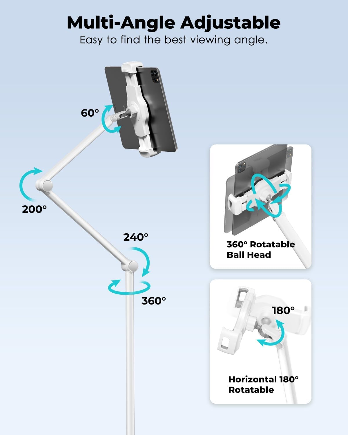 - 【Multi-Functional Tablet Stand】This is a stand designed specifically for floor use. You can easily place the stand beside the bed or sofa, watch TV programs, and engage in video calls with family. Additionally, you can use it in your office,living room, kitchen, bedroom,etc.