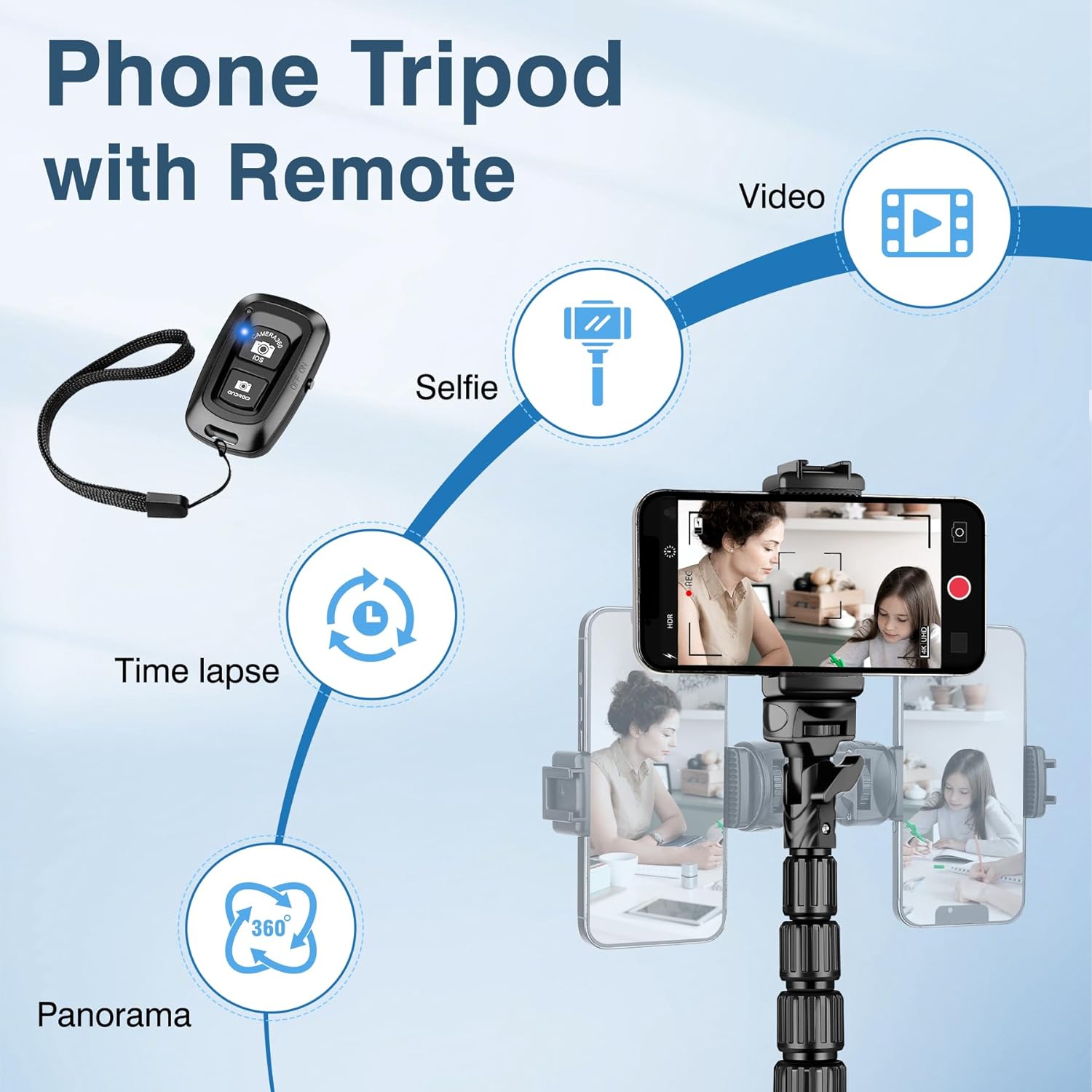 - PHONE TRIPOD WITH REMOTE: Tripod for iphone comes a wireless remote make it a breeze to taking photos or video recording. Max working range up to 33feet/10M. Cell phone tripod with remote can be perfectly compatible with most iOS and Android smartphones