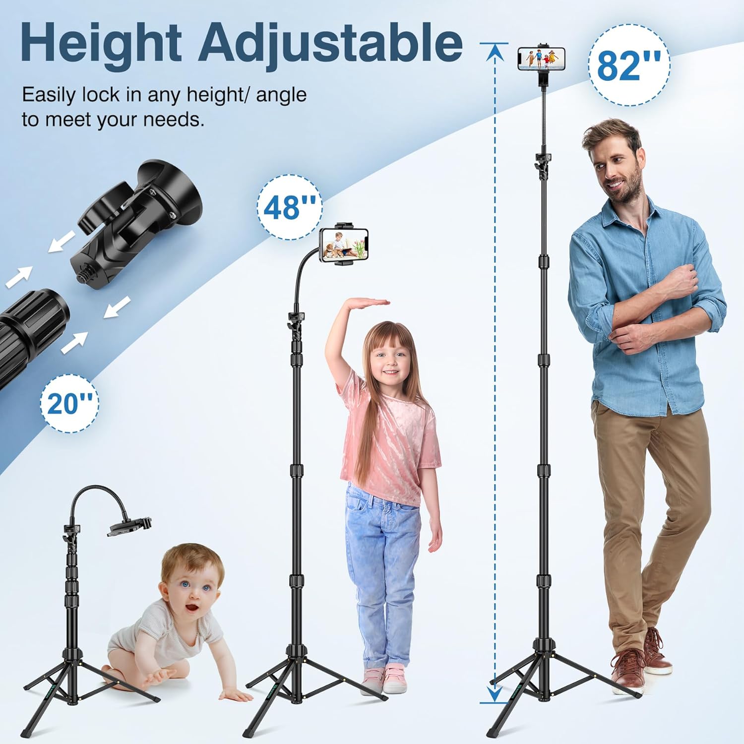- FLEXIBLE GOOSENECK TRIPOD: Starting your photography adventures with our phone tripod that extends from 20 to 82 inches. With a 15.7 inch flexible gooseneck, making it an excellent choice for capturing both low-angle and high-angle shots with precision