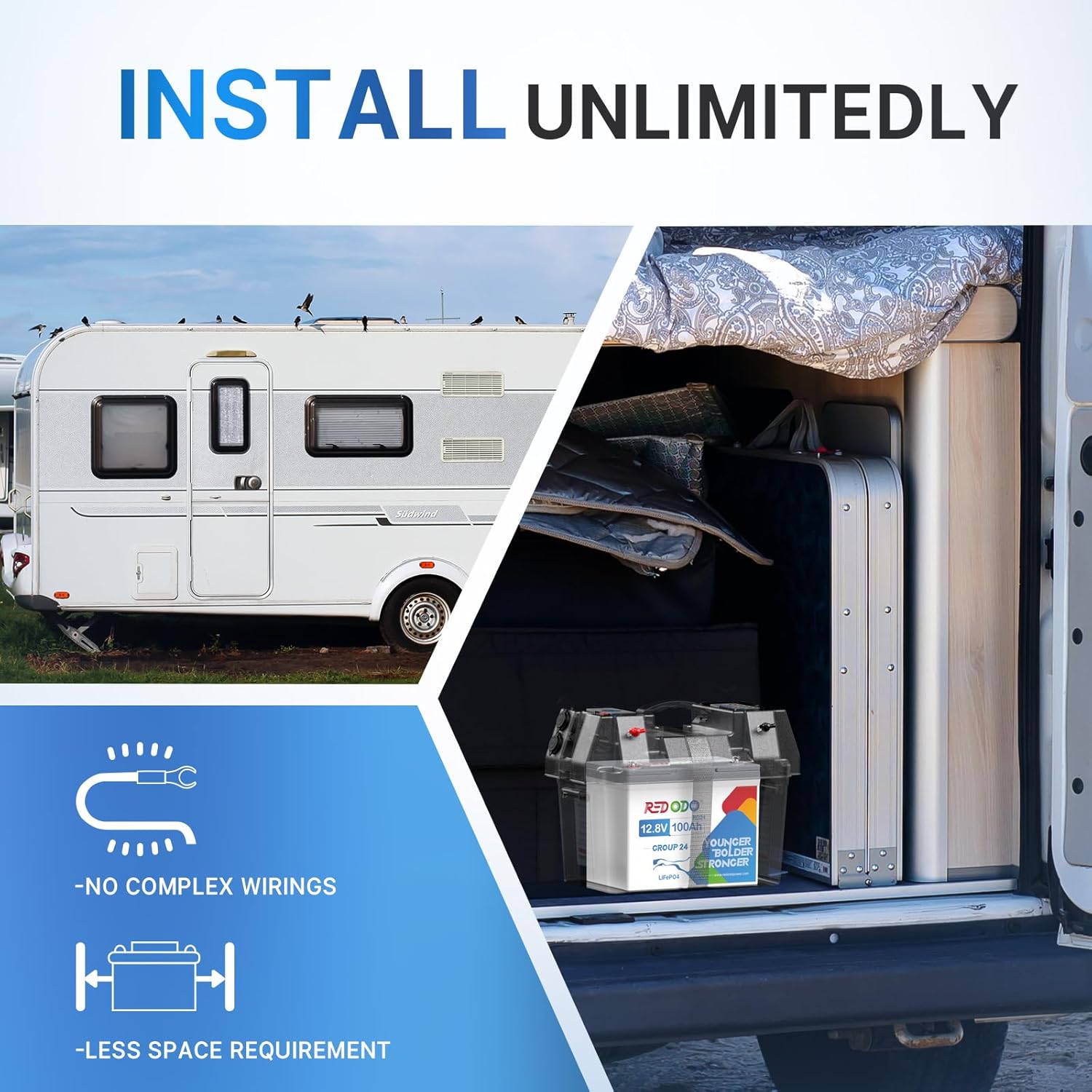 - Standard Group24 Dimensions: Redodo 12V 100Ah Group24 LiFePO4 Batteries' sizes are L10.24*W6.61*H8.3 inches, which is a perfect fit for a Group24 battery box. Besides, this battery can widely used in RV, travel trailer, class A/B/C motorhome, etc., and is properly sized in accordance with related regulations.