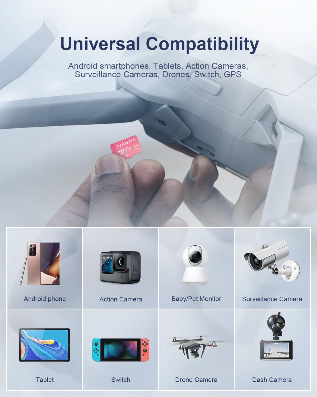 - Wide Compatibility: The memory card with two SD Adapter works seamlessly with action cameras, drones, DSLR cameras, smartphones, dash cams, security cameras, driving recorders and more