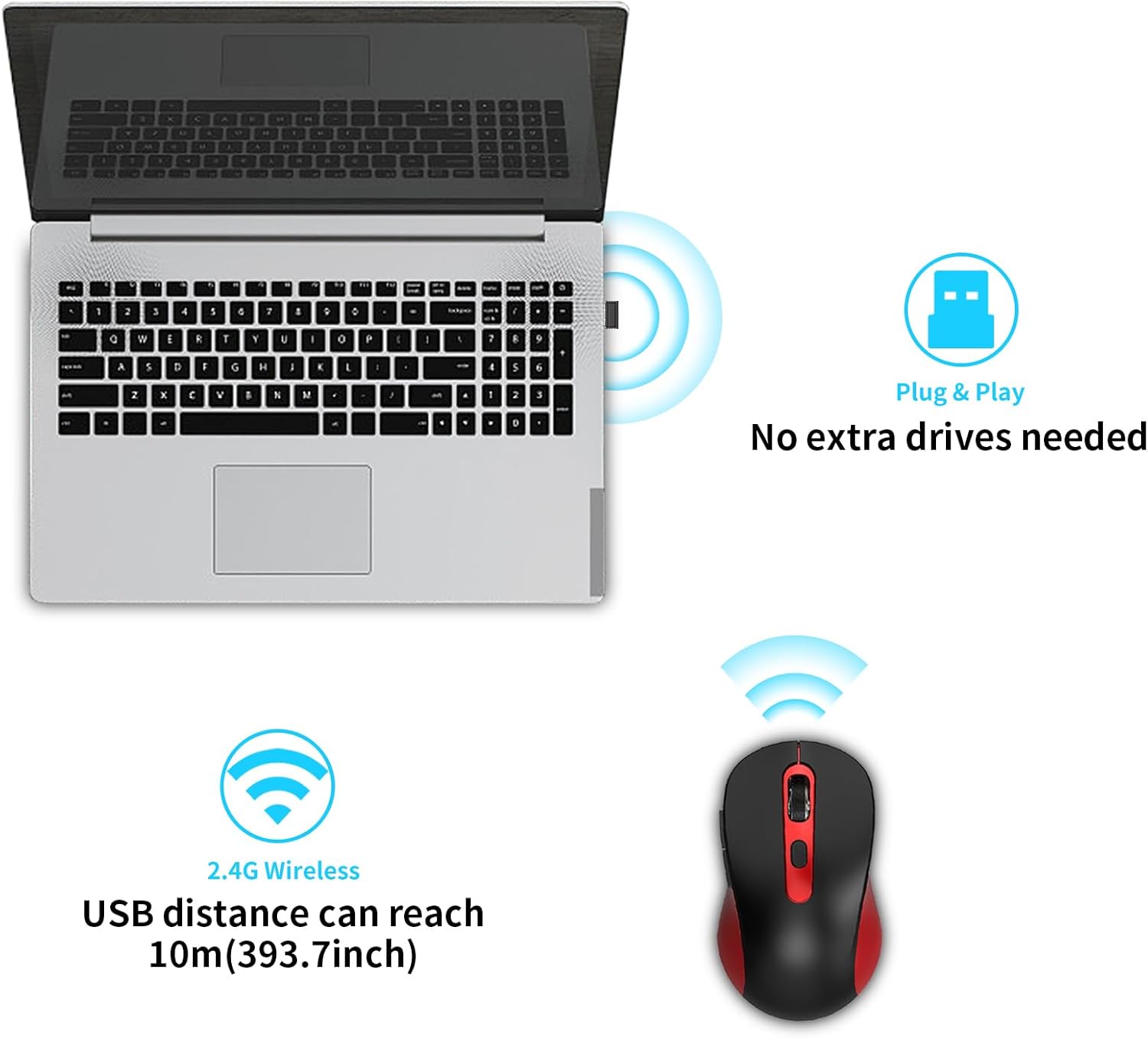 - Plug and Play - 2.4GHz wireless technology can provide a stable signal. The use range is up to 33 feet(10m), ensuring no delay or dropout.without downloading any drivers—just plug the USB receiver (stored on the back of the mouse) into your device, and it's ready to use