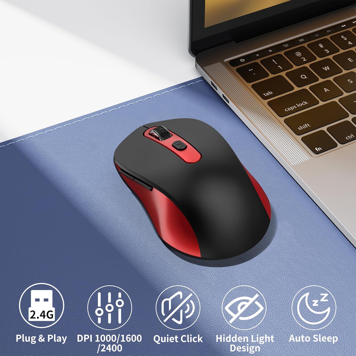 Wireless Mouse for Laptop, PC, Chromebook, Mac, MacBook, Silent Mouse with USB Nano Receiver, Side Button, 2400 DPI, Anti Slip Roller, 6 Button Ergonomics Cordless Computer Mice - Black Red