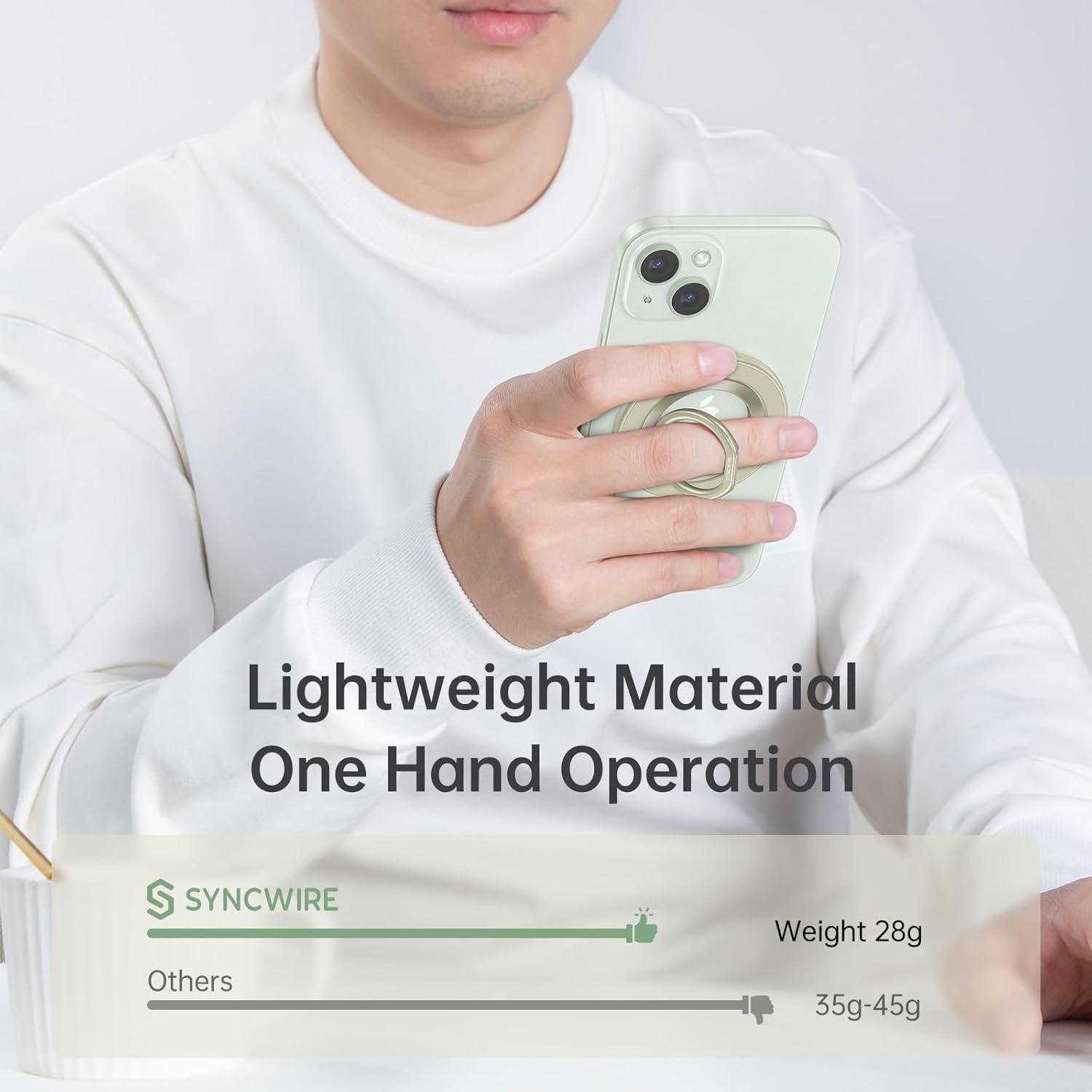- 【Super Strong Magnetic】The Syncwire MagSafe phone ring holder is crafted with N55 NdFeB magnets to provide superb magnetic force. You can securely attach your phone to the MagSafe magnetic phone ring holder with just one finger, experiencing a firm hold that resists shaking or movement. The magnetic force is further enhanced when used with the provided metal rings.