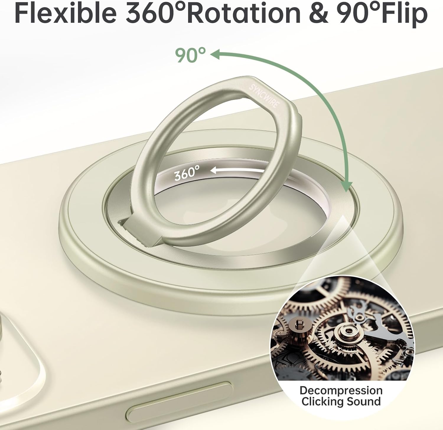 - 【Wide Compatibility】The Syncwire MagSafe phone ring holder is designed specifically for use with MagSafe devices and certified MagSafe phone cases. The magnetic phone ring grip is also compatible with non-magnetic phones and standard phone cases with thin metal rings (provided) on their backs. Widely compatible with all Apple and Android smartphones, including iPhone 15/14/13/12 Series, iPhone 11/11Pro/X/XS/XS Max/8/7, Samsung GalaxyS23/S22/S21, Google Pixel P8 P7, and more.