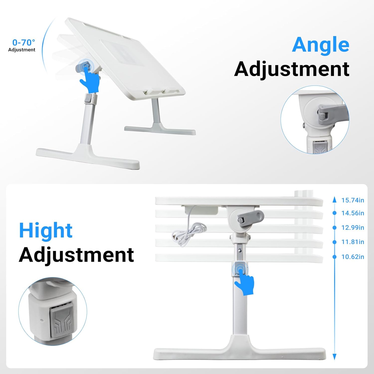 - 【📐Adjustable Size for Optimal Use】Measuring 15.74 x 23.62 inches(60*40cm), this height-adjustable laptop table adapts from 10.62" to 15.74"(27-40cm), thanks to its convenient auto-lock buttons. Its foldable legs ensure easy storage, and the 24.4 inches leg clearance offers comfortable movement. The tabletop's angle is adjustable up to 70°, promoting better posture and reducing strain.