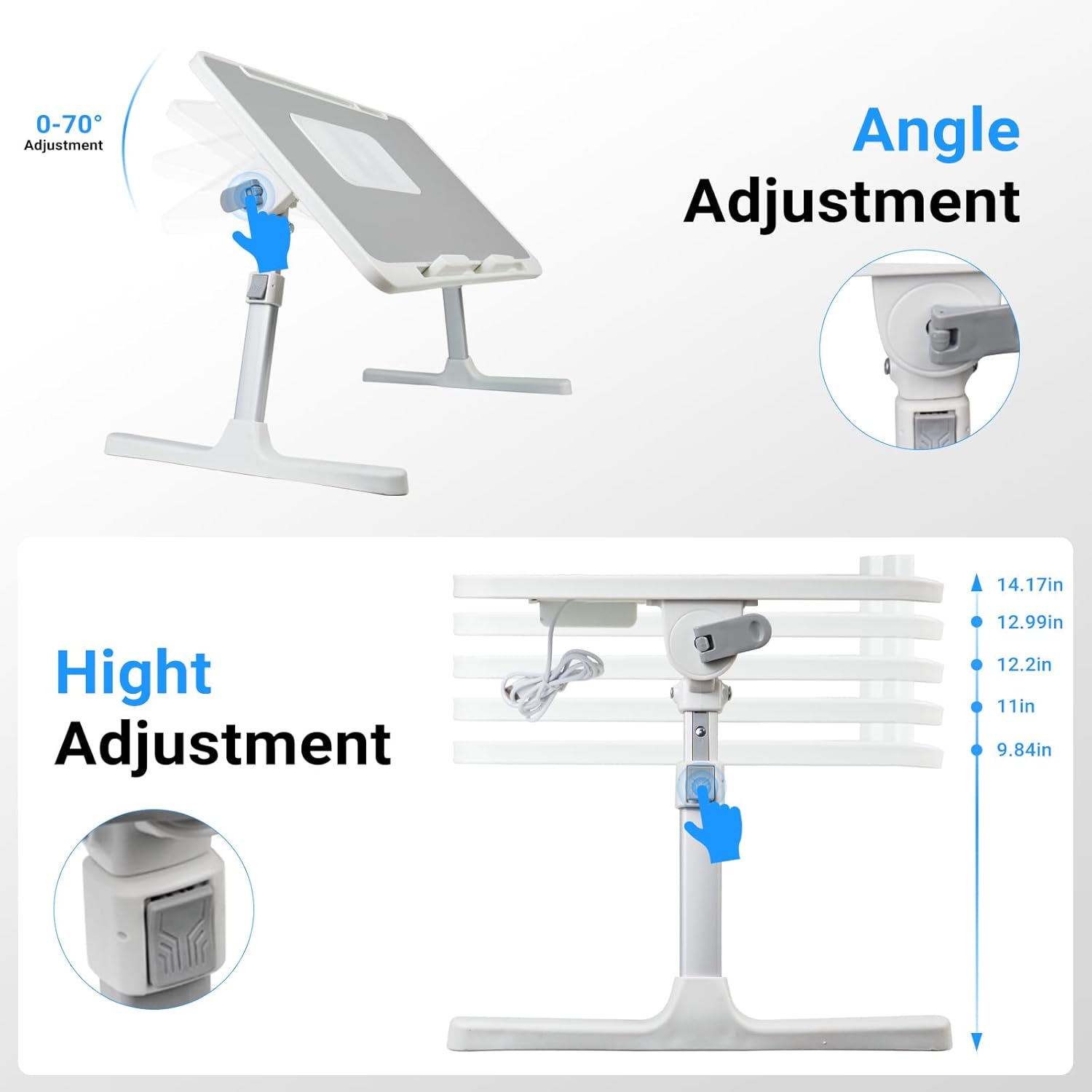 - 【📐Adjustable Size for Optimal Use】Measuring 22.04 x 12.59 inches(56*32cm), this height-adjustable laptop table adapts from 9.84" to 14.17"(25-36cm), thanks to its convenient auto-lock buttons. Its foldable legs ensure easy storage, and the 21.25 inches leg clearance offers comfortable movement. The tabletop's angle is adjustable up to 70°, promoting better posture and reducing strain.