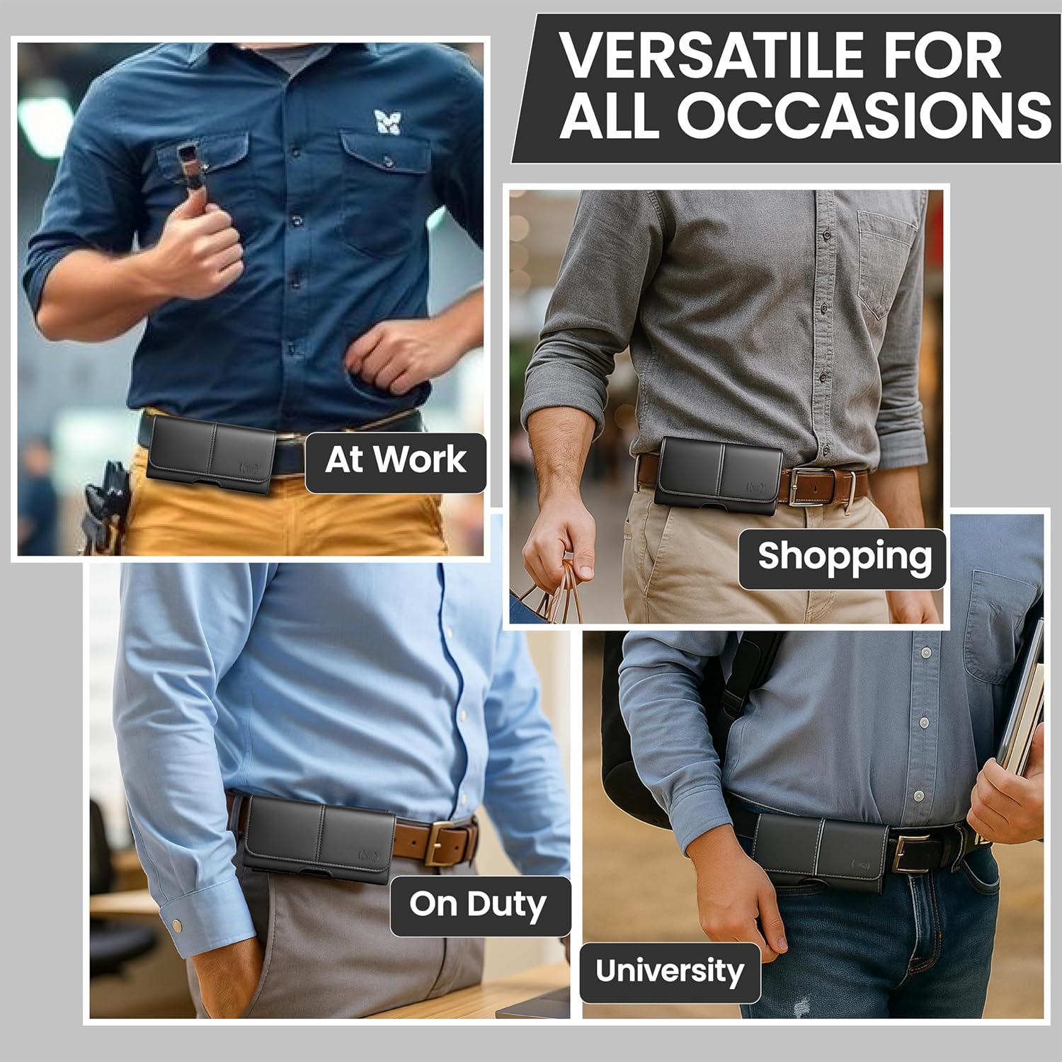 - ๐๐ง๐ข๐ฏ๐๐ซ๐ฌ๐๐ฅ ๐๐จ๐ฆ๐ฉ๐๐ญ๐ข๐๐ข๐ฅ๐ข๐ญ๐ฒ โ ๐ ๐ข๐ญ๐ฌ ๐๐๐ญ๐๐ฌ๐ญ ๐๐จ๐๐๐ฅ๐ฌ: This Cell Phone Holder for belt, Fits iPhone 17/16/15/14/13/12/11Pro/16e, XR, Pixel 9a, Pixel 9, Pixel 8, Pixel 7a, Galaxy S25/S24/S23/S22/S21/S20/S10/S9/S8+. Fits slim Horizontal Phone Pouch & heavy-duty cases up to (6.29"W x 3.14"H), screen (see size chart).