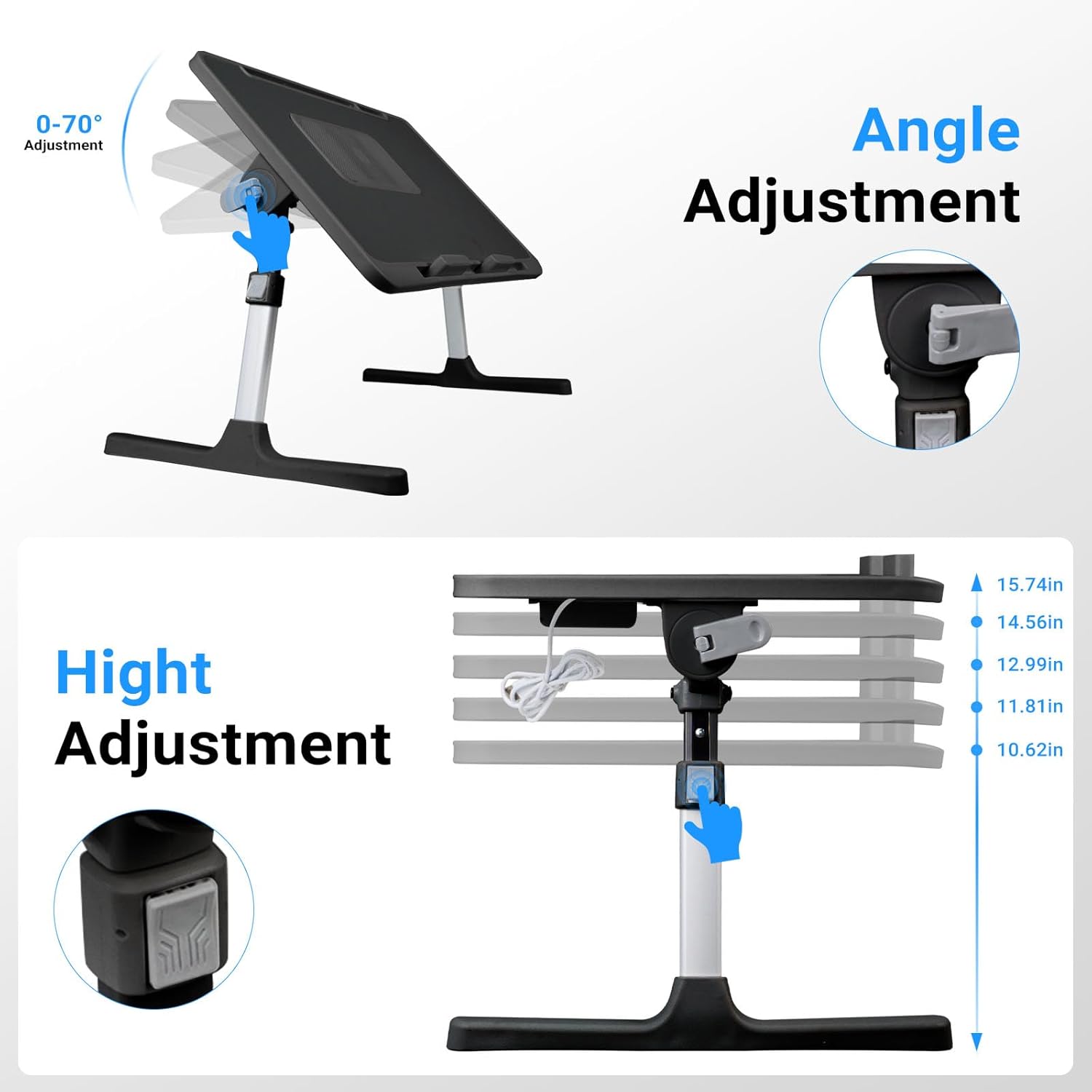 Laptop Lap Desk with Cooling Fan - Adjustable with Light, USB, Storage Drawer - Folding Bed Desk,23.62"*15.74",Black