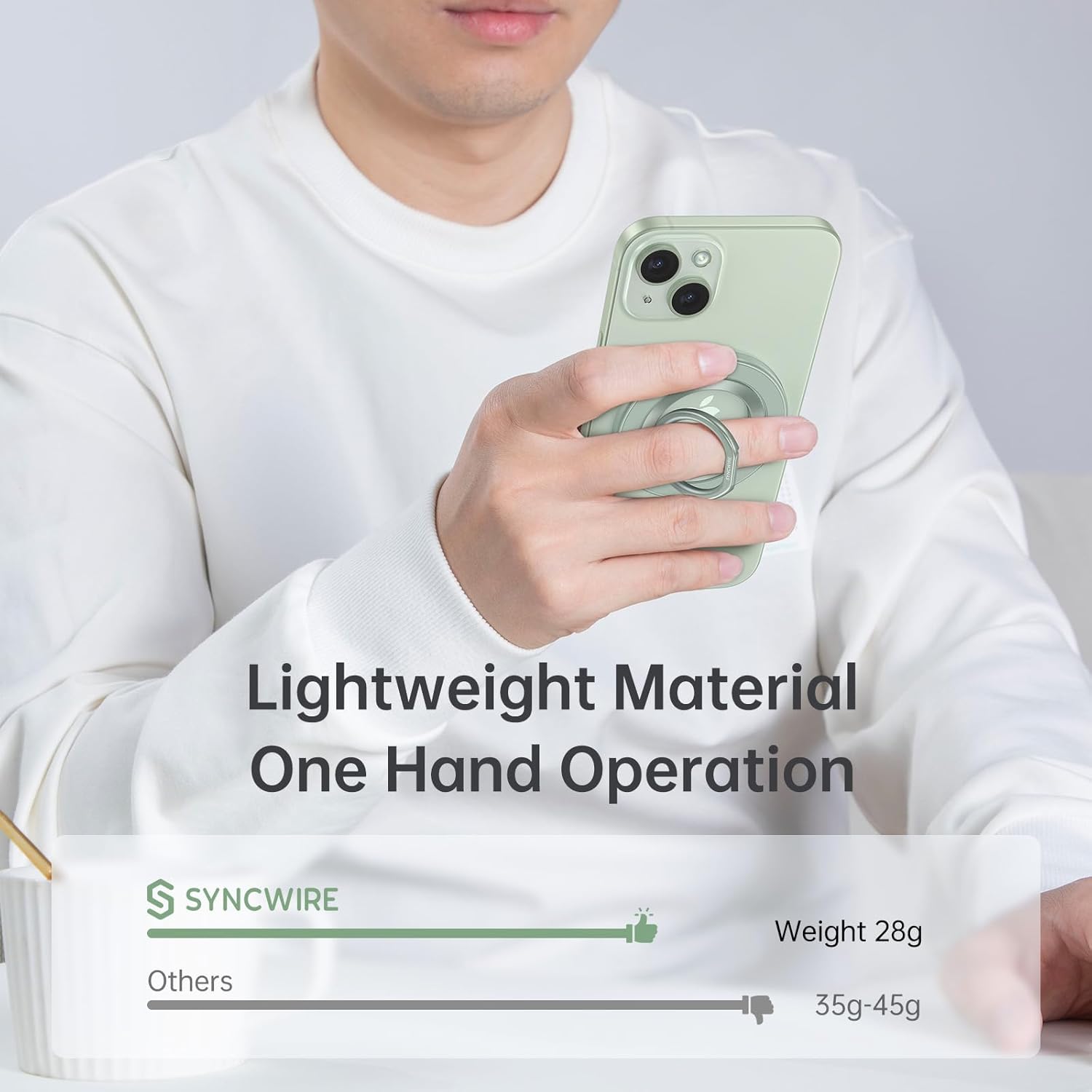 - 【Super Strong Magnetic】The Syncwire MagSafe phone ring holder is crafted with N55 NdFeB magnets to provide superb magnetic force. You can securely attach your phone to the MagSafe magnetic phone ring holder with just one finger, experiencing a firm hold that resists shaking or movement. The magnetic force is further enhanced when used with the provided metal rings.