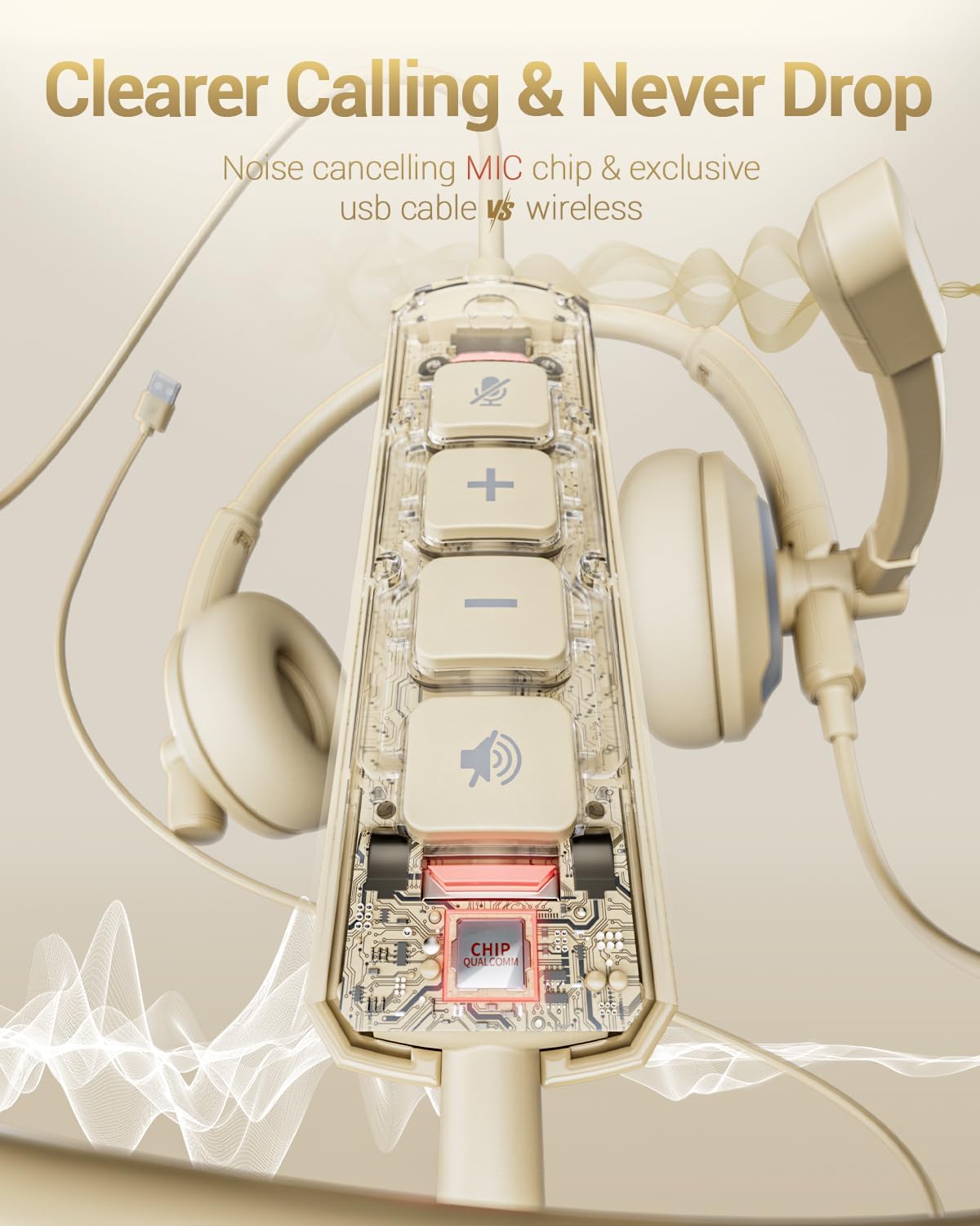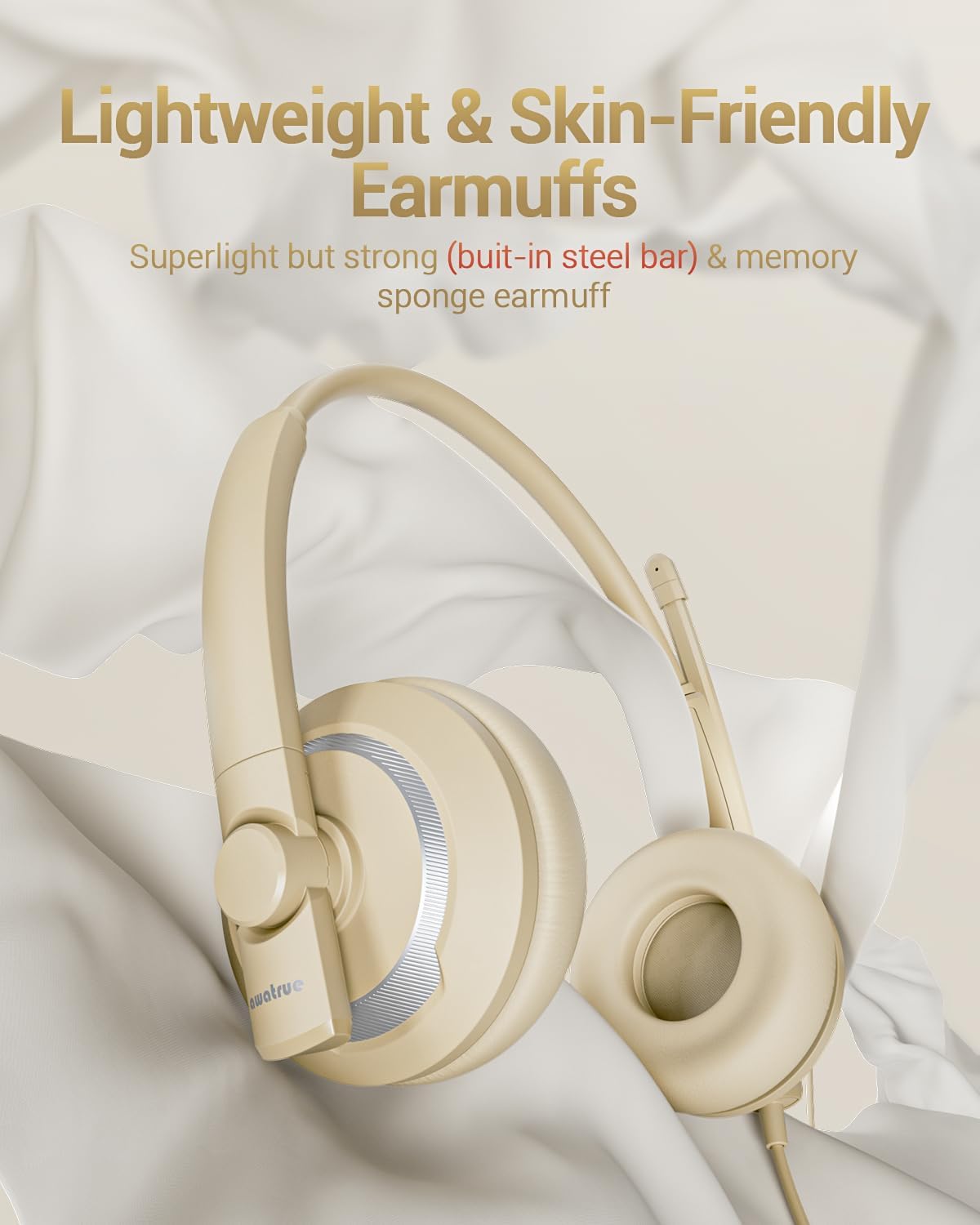 USB Headset with Microphone for PC Laptop - Headphones with Noise Cancelling Microphone for Computer,On-Ear Wired Office Call Center Headset for Boom Skype Webinars,Lightweight-Apricot