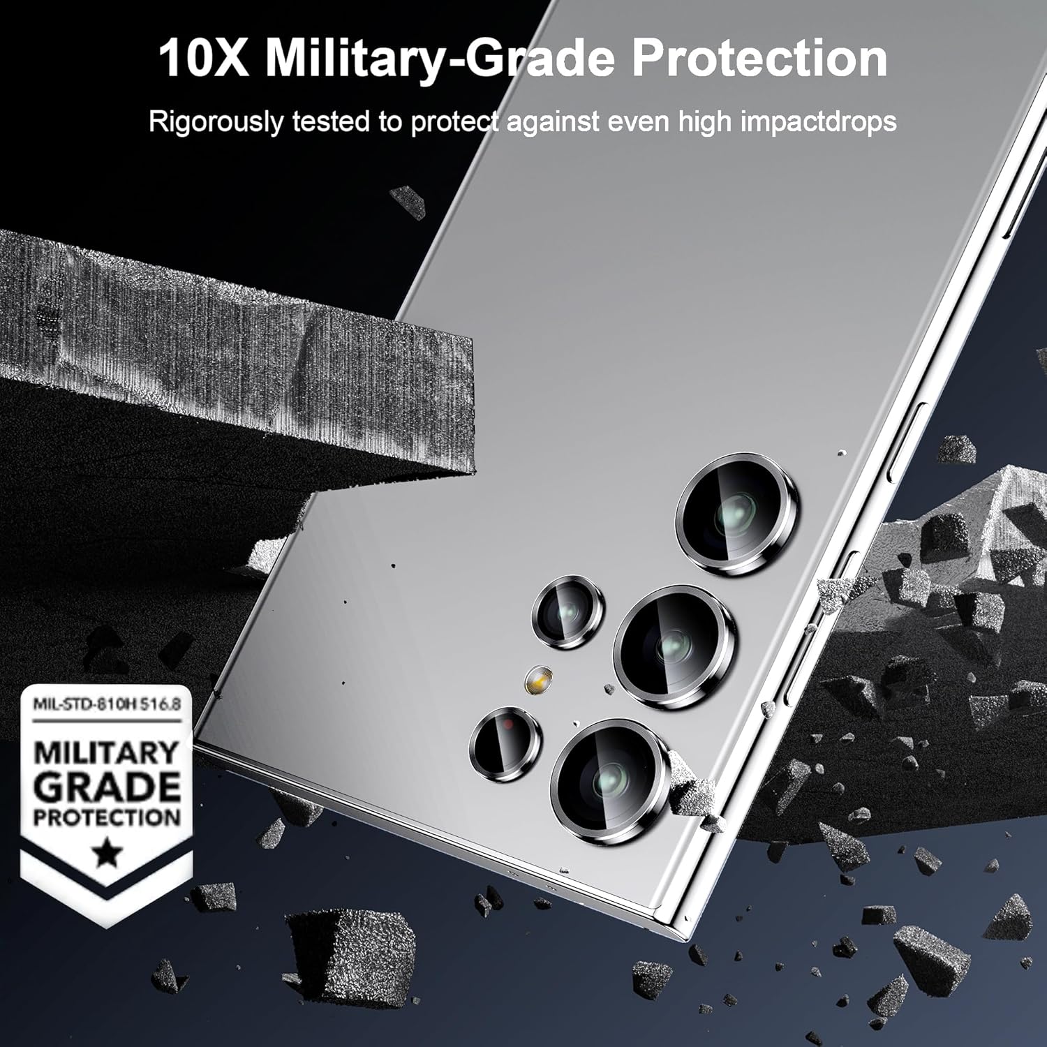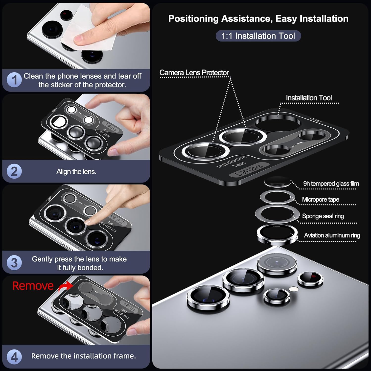- Military Grade Protection & Anti Fingerprint: Made of space titanium alloy + 9H tempere glass materials, provide powerful scratch resistance against everyday hard and sharp objects. The seal ring is designed to prevent fingerprints, sweat and grease residues. Keep your s24 ultra camera original beauty.