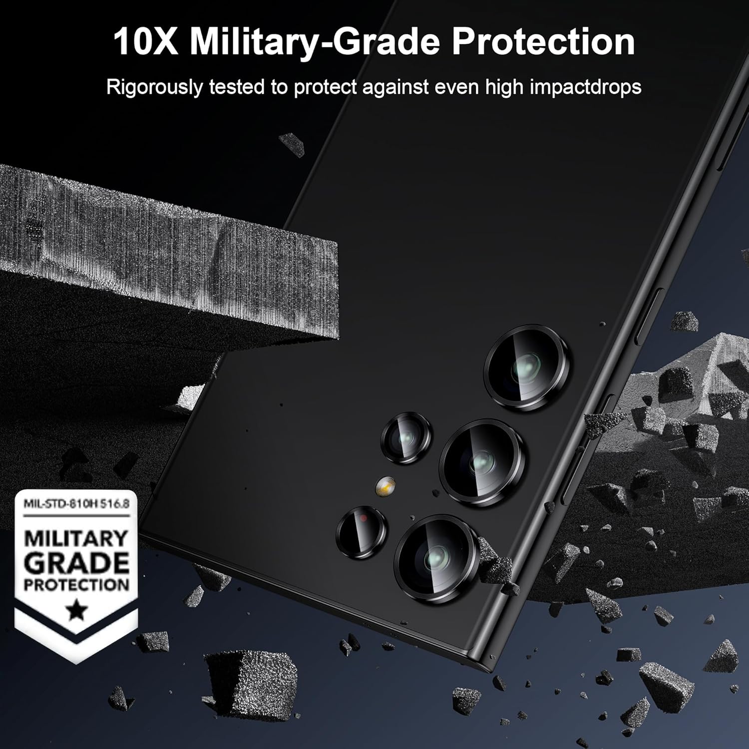 - Military Grade Protection & Anti Fingerprint: Made of space titanium alloy + 9H tempere glass materials, provide powerful scratch resistance against everyday hard and sharp objects. The seal ring is designed to prevent fingerprints, sweat and grease residues. Keep your s24 ultra camera original beauty.