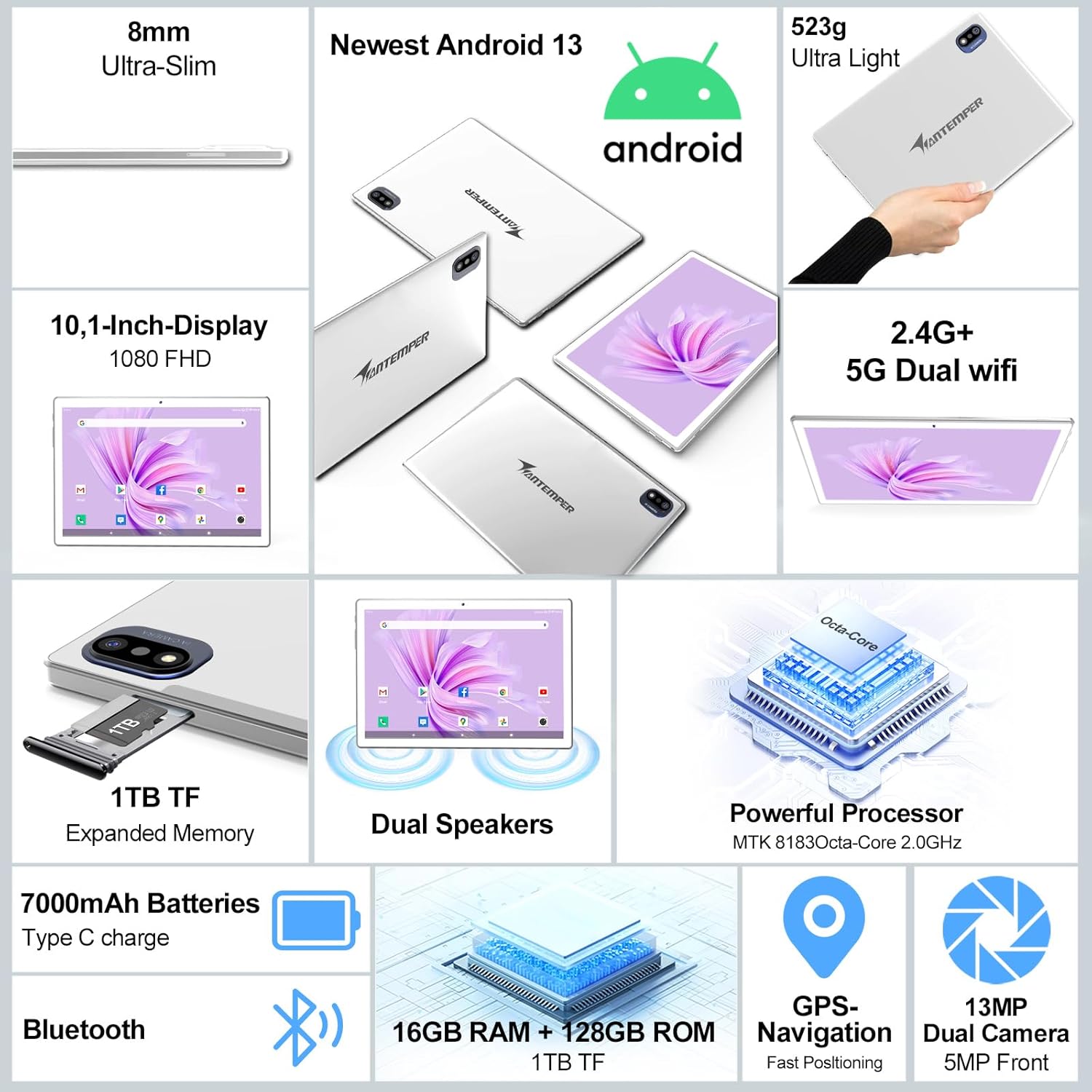 ANTEMPER Latest Android Tablet 10.1 Inch, 5G WiFi Tablets Mit 16GB RAM+128GB ROM(1TB TF),2 in 1 Tablet with Keyboard Mouse Pen-Octa-Core2.0Ghz | 7000mAh | 1080FHD | 13MP Camera | WLAN GPS -Silvery