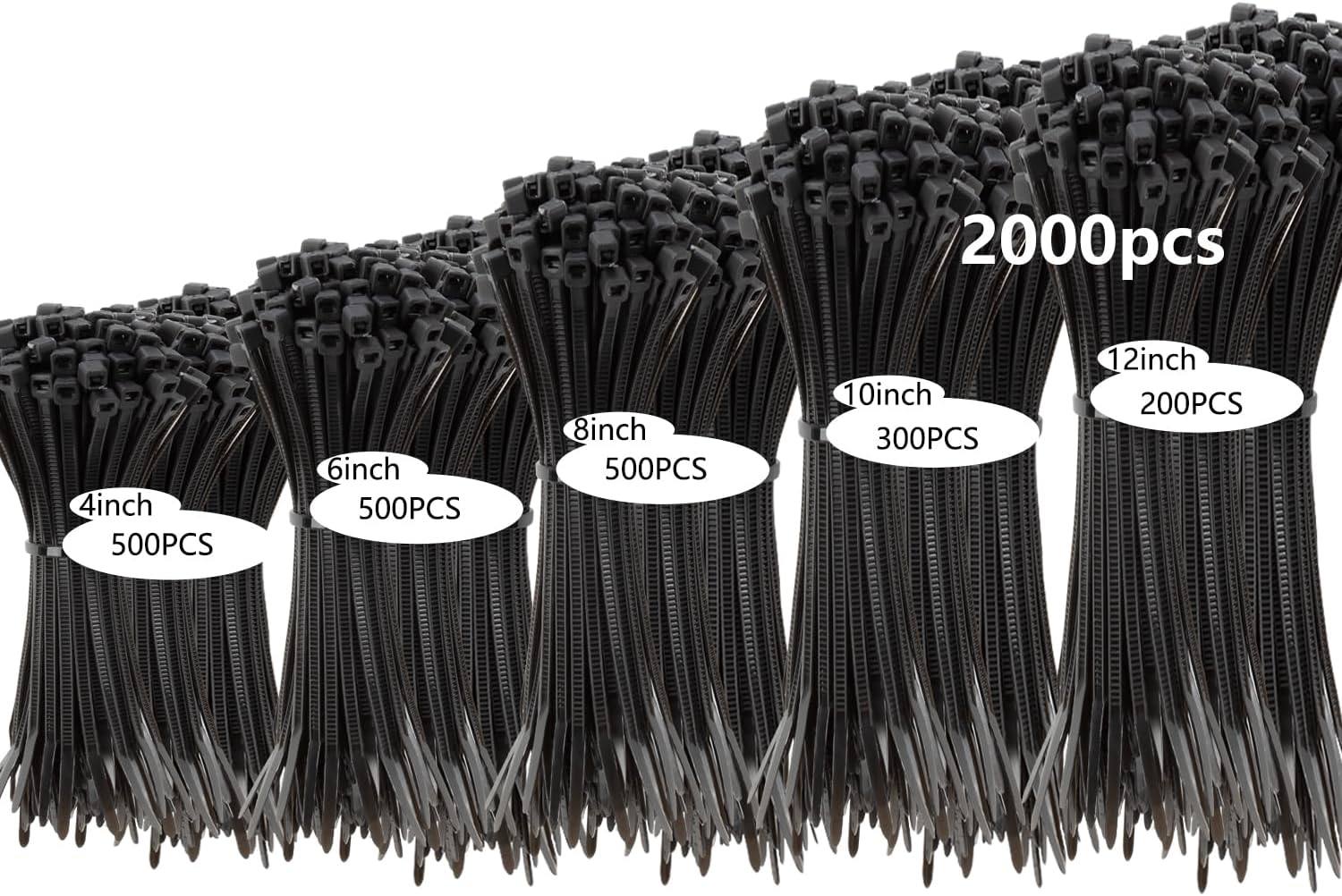 - 【Packages include】2000 pcs cable ties (4 inch 500pcs , 6 inch 500pcs , 8 inch 500pcs , 10 inch 300 pcs ,12 inch 200 pcs). Different sizes of cable ties basically meet your daily or working needs.
