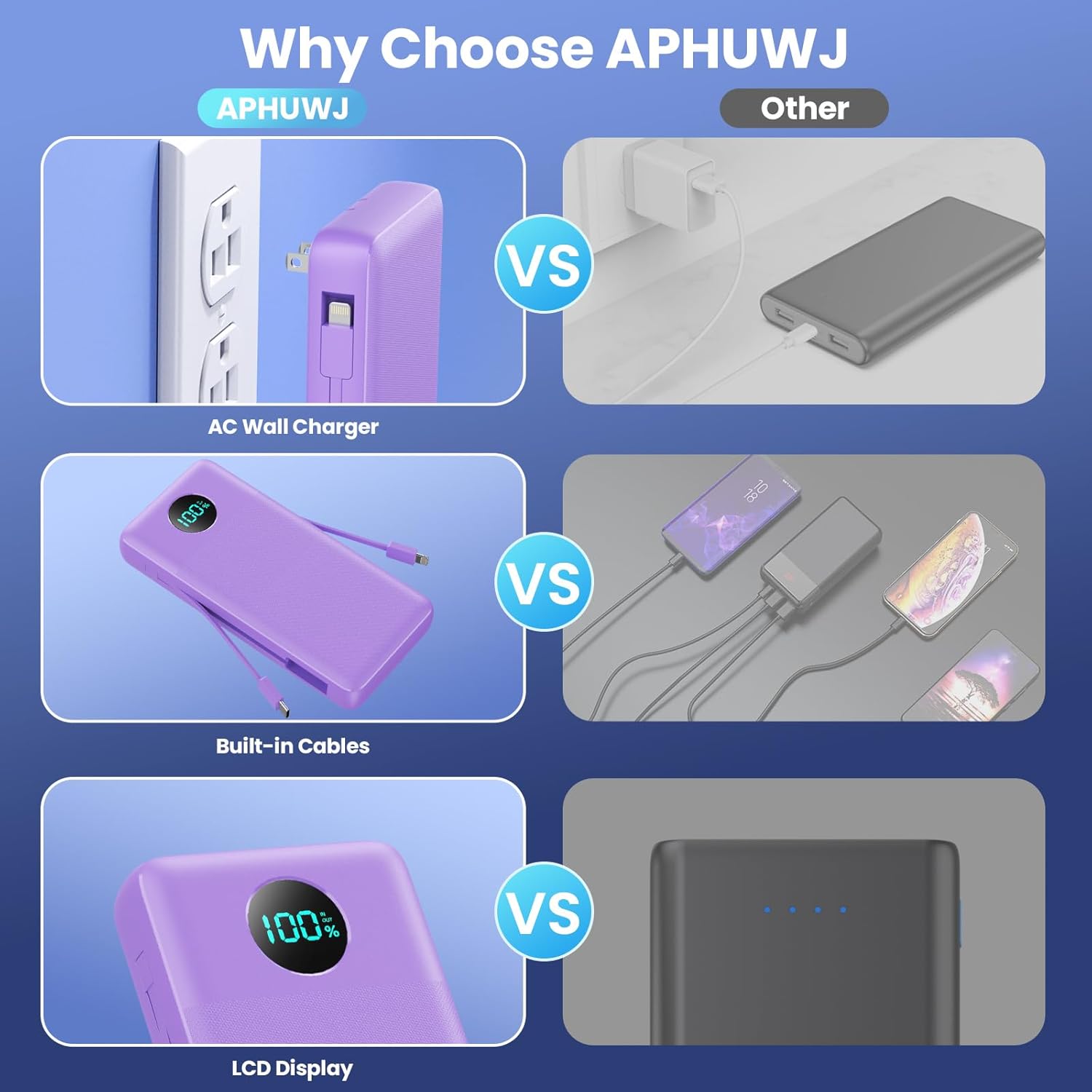 - Portable Charger Built-in Cables: Power bank with built-in cords charge both an android or ios phone, and 33800mah capacity can provide about 6-8 charges for your phones. You don't have to carry any extra cable or adpter to charge your phone and the portable battery charger itself, enjoy your trip.