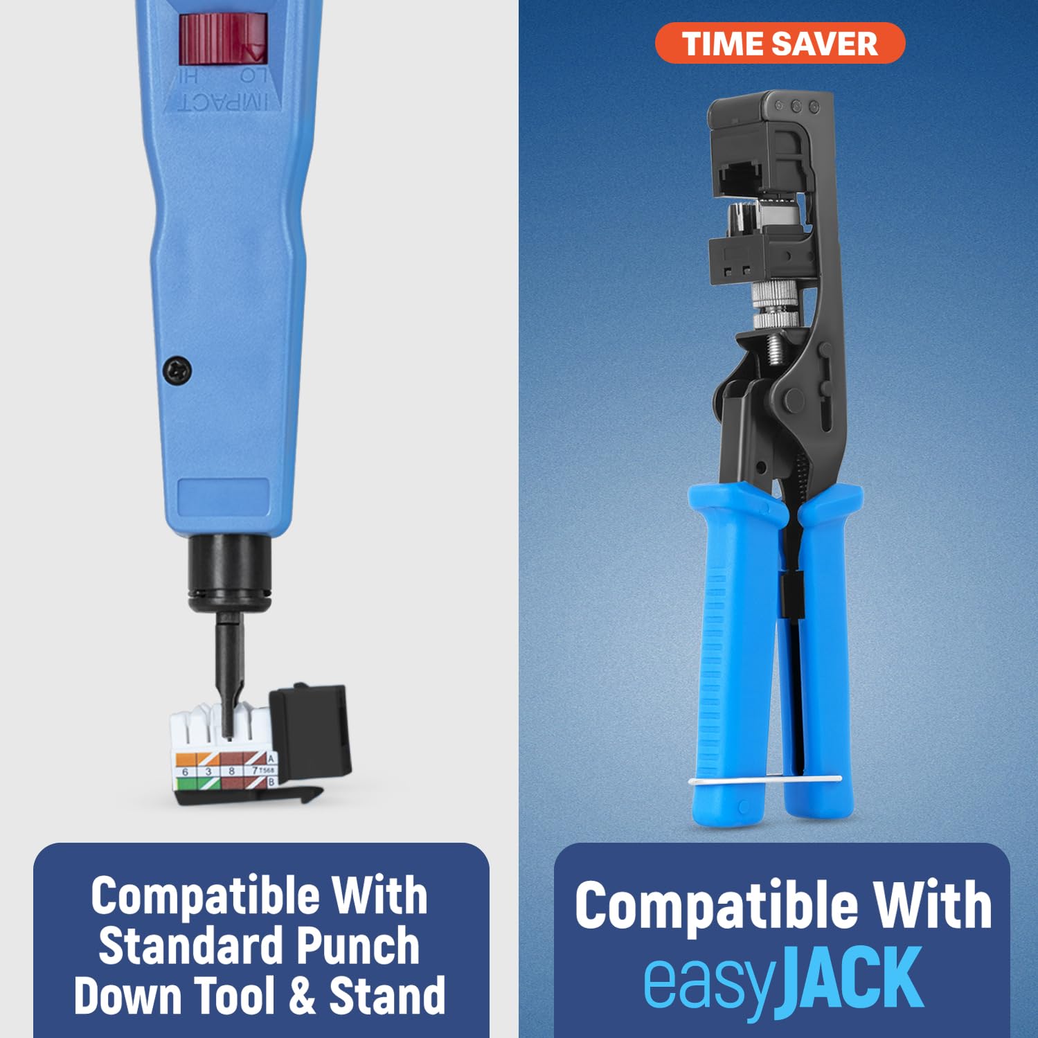 - Compatibility - compatible with our 90 degree angled speed termination tool - easyJACK (B094WB91H3). These cat 5e jacks keystone rj45 can also work in conjunction with a standard punch down tool and punch down stand for convenience.
