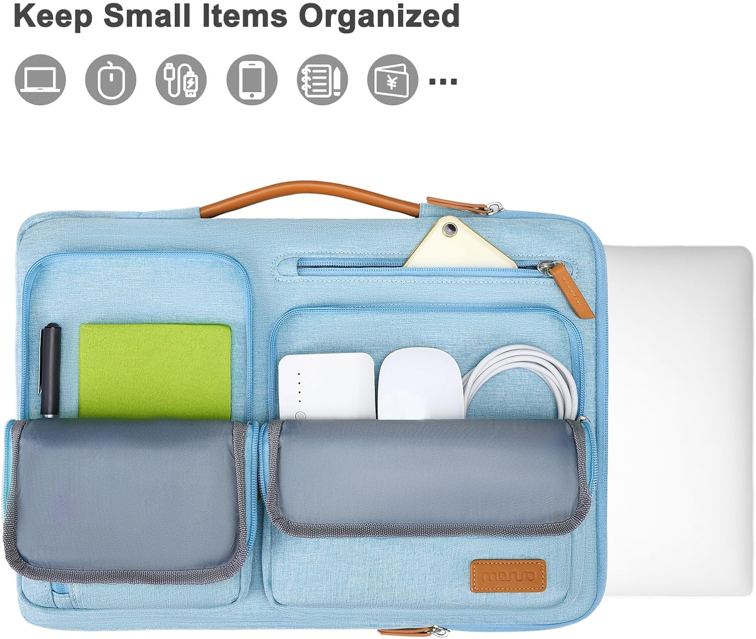 - 360 degree all around protective reinforced interior edge briefcase carrying case bag protect your laptop from any accidental dropping. Extendable handle design makes it to carry your laptop around in comfort, you can also tuck away the handle. Side opening zipper design, avoid accidental dropping of your laptop while carrying. 4 front zipper pockets provide enough space to keep mouse, earphone, pens and notepads, offering added convenience.