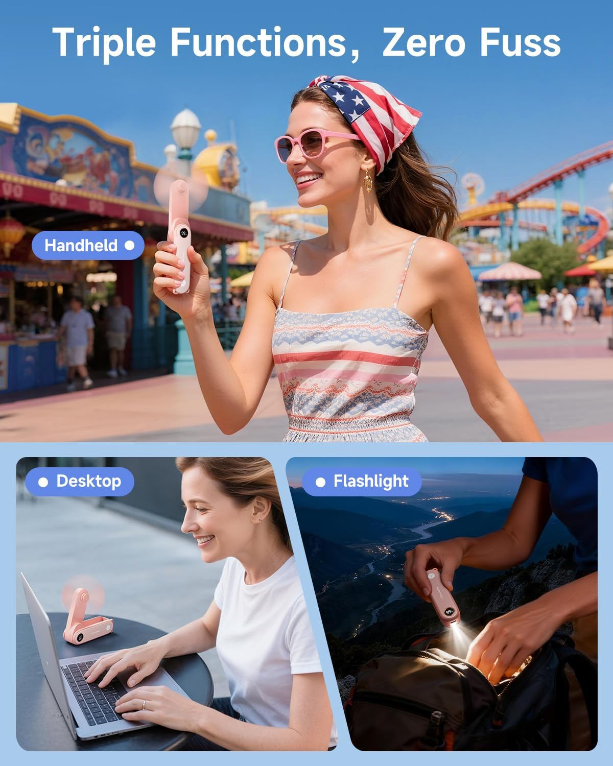 - [Emergency Flashlight Function] It doubles as a convenient flashlight(press twice to activate.), ensuring preparedness for nighttime adventures or unexpected situations—a must-have hand fan for travel and outdoor activities.