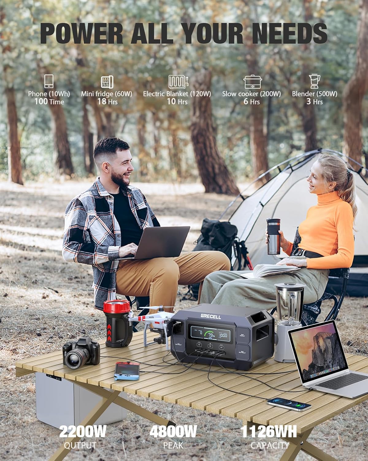 - 【Safe LiFePo4 Battery Pack】GRECELL portable power station 2200w uses industry-leading LiFePO4 batteries with a cycle life of up to 3500+ times. The built-in battery management system (BMS) provides up to 12 types of protection for the battery. The AC port short circuit protection effectively prevents outdoor electric shock and ensures outdoor power consumption safe