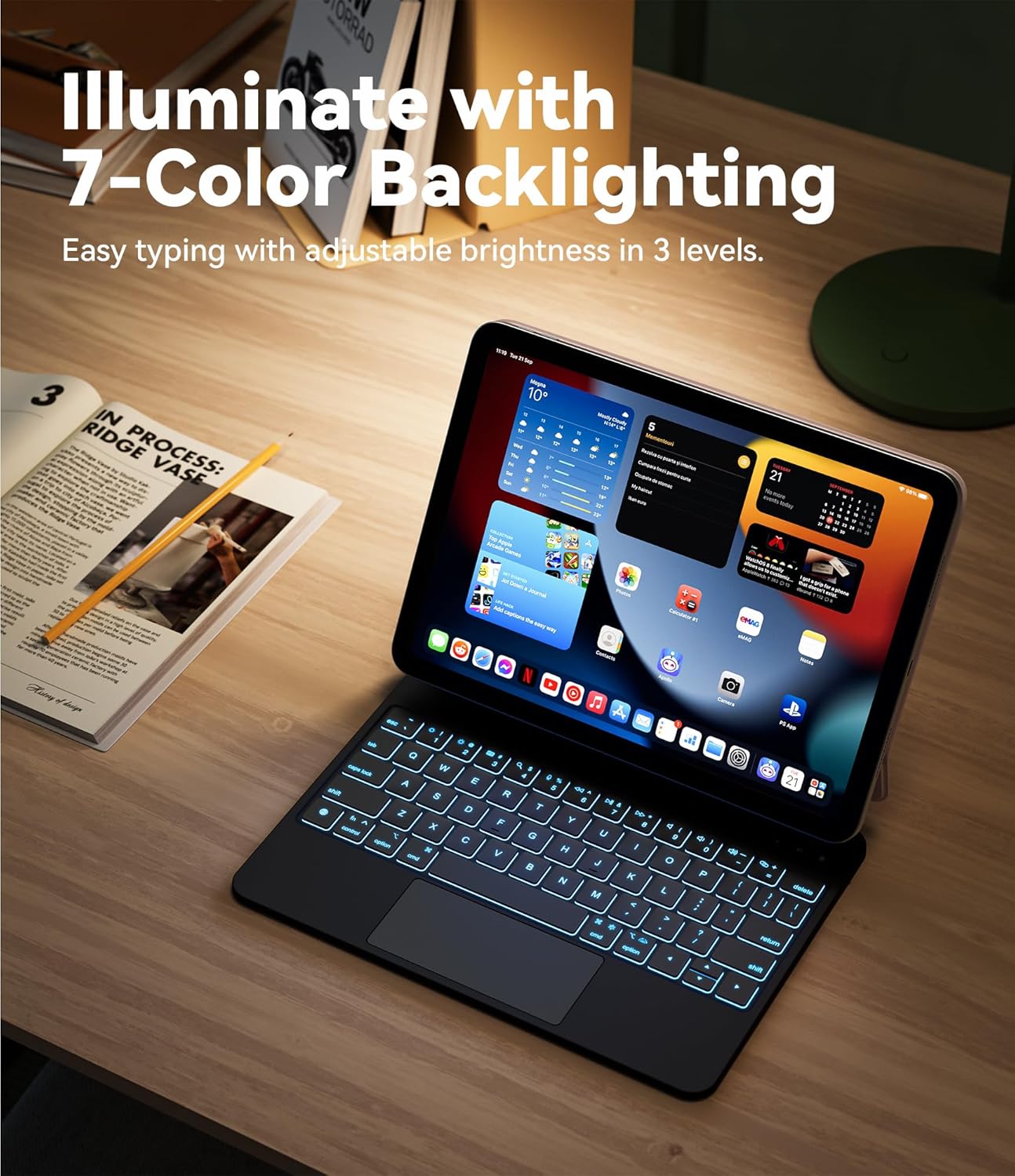 - Vibrant Backlight Customization: Infuse your workspace with personality using the backlight selection. Unleash your creativity by choosing from 7 vivid colors across 3 brightness levels, empowering you to tailor the perfect ambiance for your typing experience case with keyboard for iPad 11th Generation. Elevate your keyboard aesthetics and create an atmosphere that complements your unique style, making every typing session a visually delightful experience.