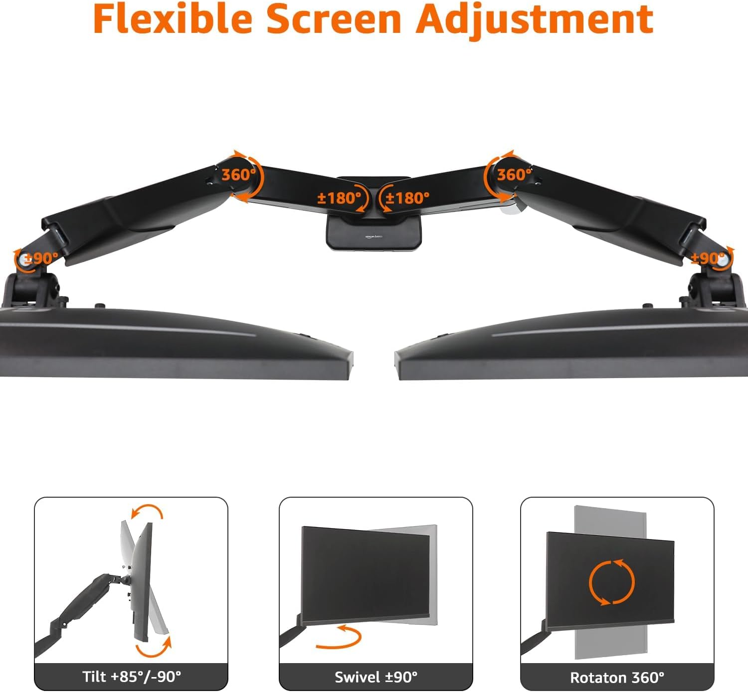 Amazon Basics Gas Spring Dual Computer Monitor Arm Mount, Adjustable, Holds up to 27" Monitors, Black