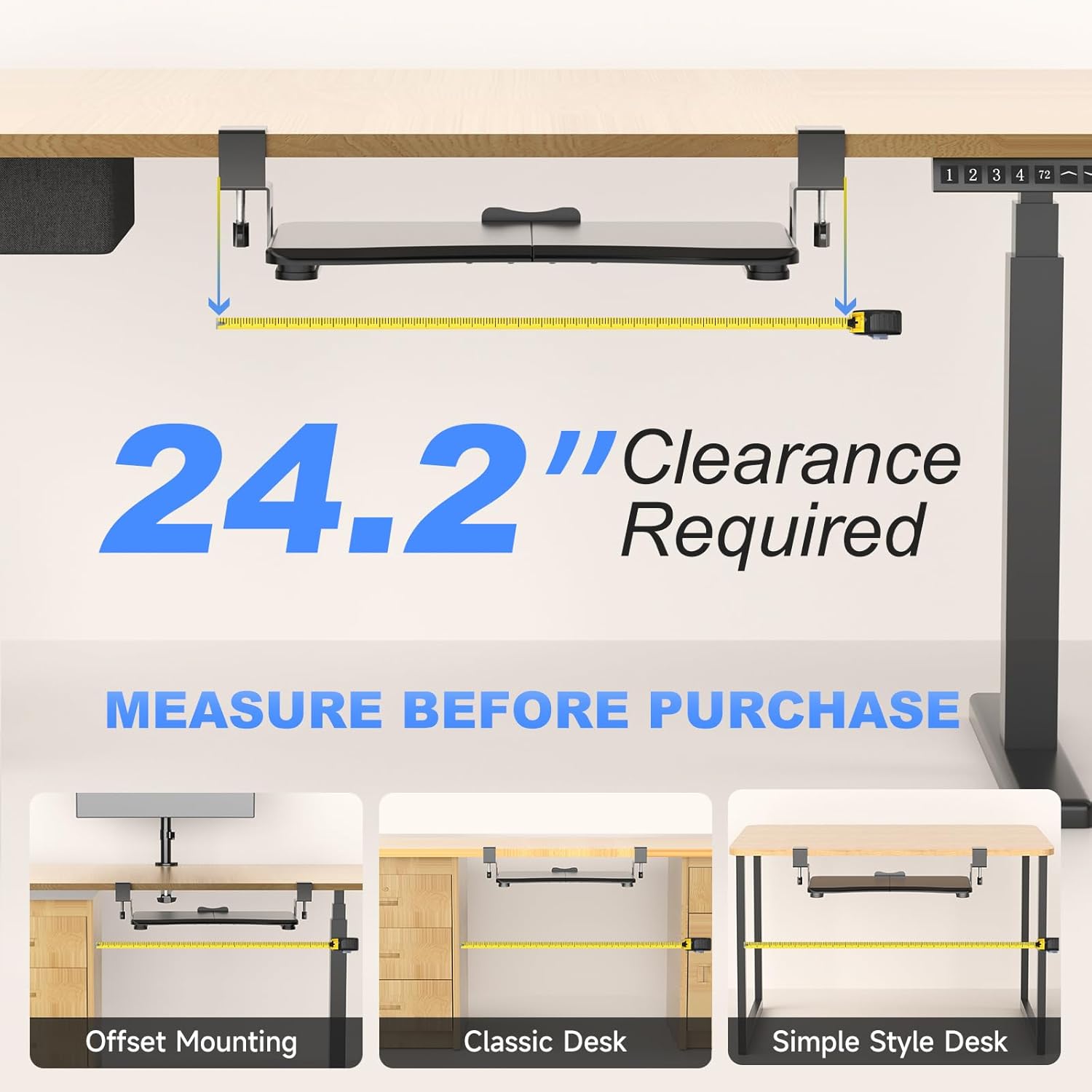 - Universal - This 20" (24.2" including clamps) x 11.8" under-desk keyboard tray holds your small keyboard, mouse, and other small accessories below the desktop to add work space. Please not it does NOT fit if your desk thickness is over 1.57”.