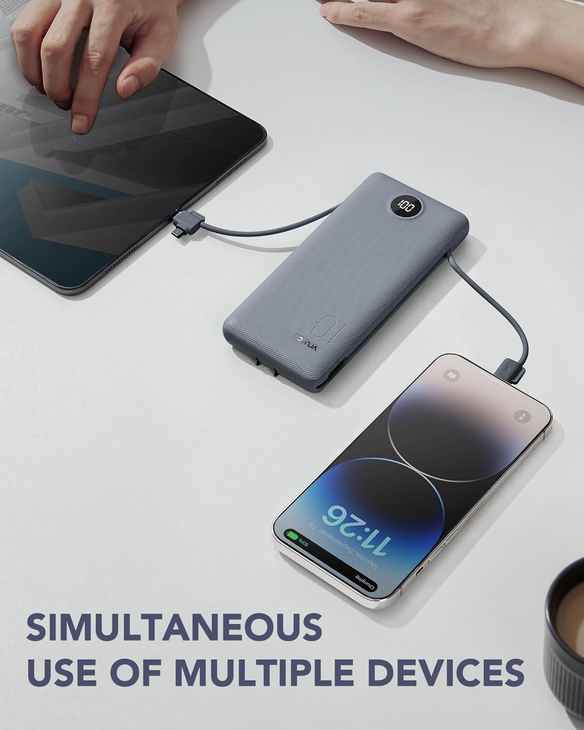 - [High Capacity & Universal Compatibility] Boasting a 10,000mAh capacity, this USB-C portable charger can power your devices 2.5 to 4 times on a single charge, depending on the device. It's compatible with iPhones, Android devices, and most USB-C enabled gadgets using the built-in cables.