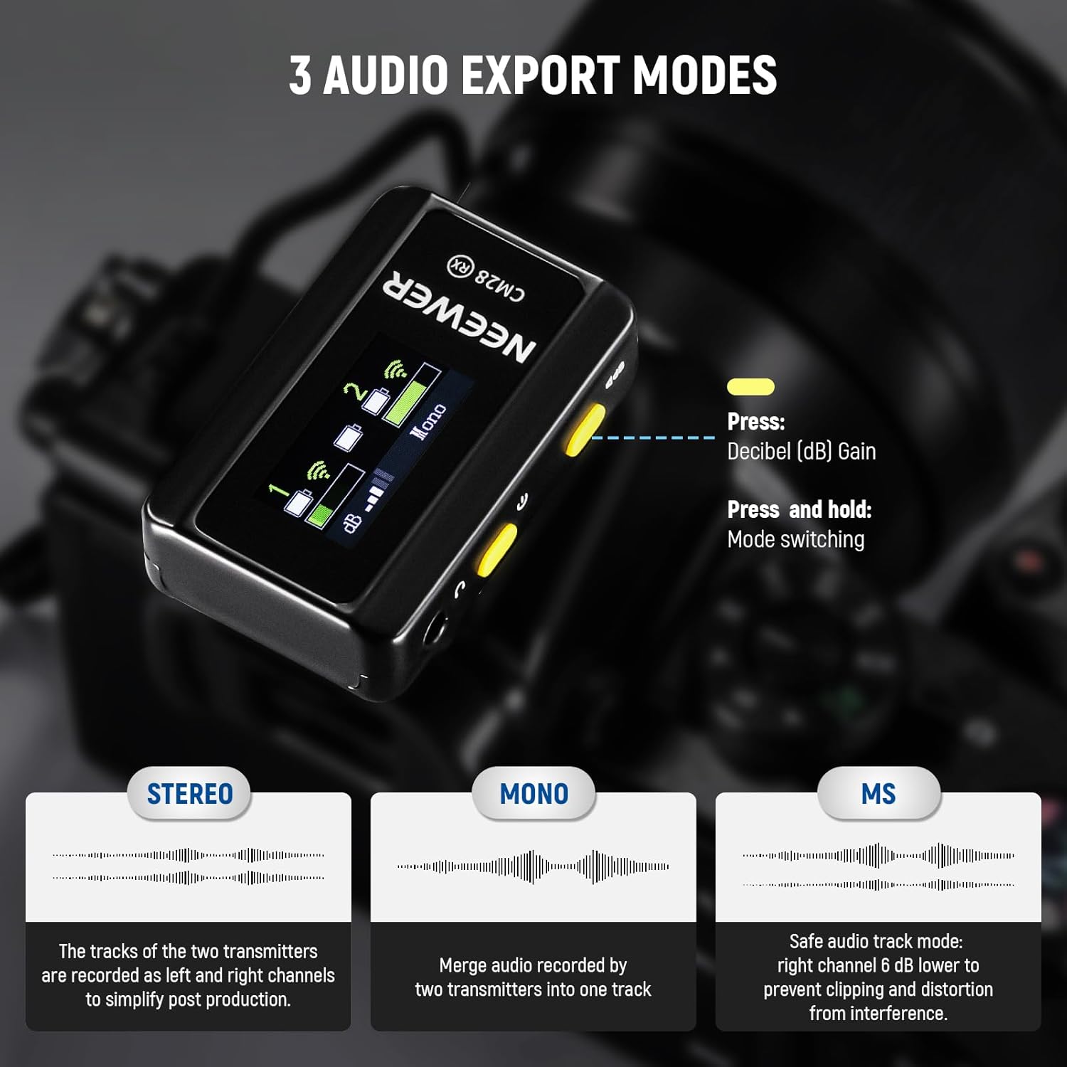 - 【Standalone Recording & 4GB Audio Storage】 The transmitters double as recording pens with each 4GB storage for saving up to 9 hours of uncompressed 48KHz WAV audio files. 3 audio export modes at your option: Mono, Stereo, and Ms. Also supports one tap decibel (dB) gain. An LCD screen displays export modes, volume, battery levels, connection status, noise cancellation, and other information