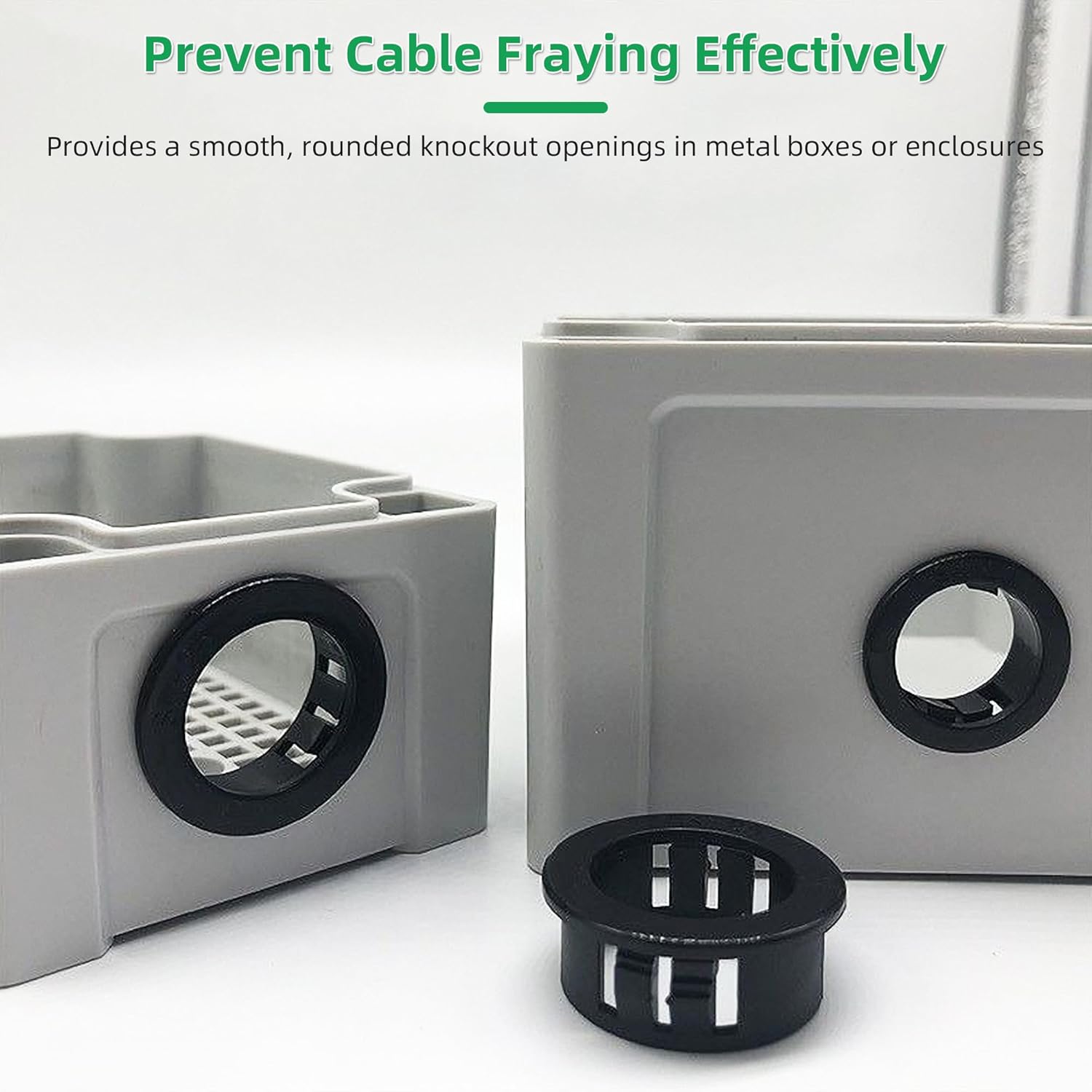 - VERSATILE APPLICATION: Our plastic grommets converts raw-edged holes to smooth neat insulated holes and absorbs vibration and cushions; it also can fix cable or prevent abrasion or scratches on tubing hoses shafts and utility lines to improve safety; Used on all types of electrical industrial and automotive equipment and machinery