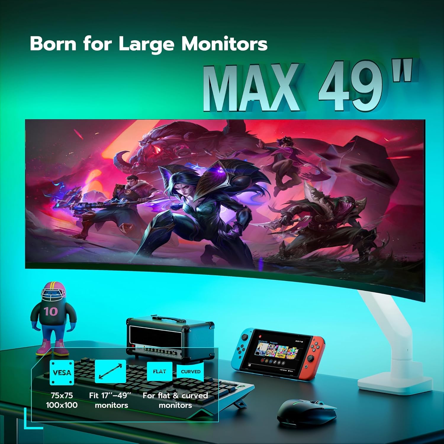 ARES WING Ultrawide Monitor Arm White for 17 to 49 Inch Heavy Duty Curved Screen, Holds 44 Lbs, Adjustable Gas Spring Monitor Arm Desk Mount with C Clamp, Grommet Base, 75/100 Vesa Mount