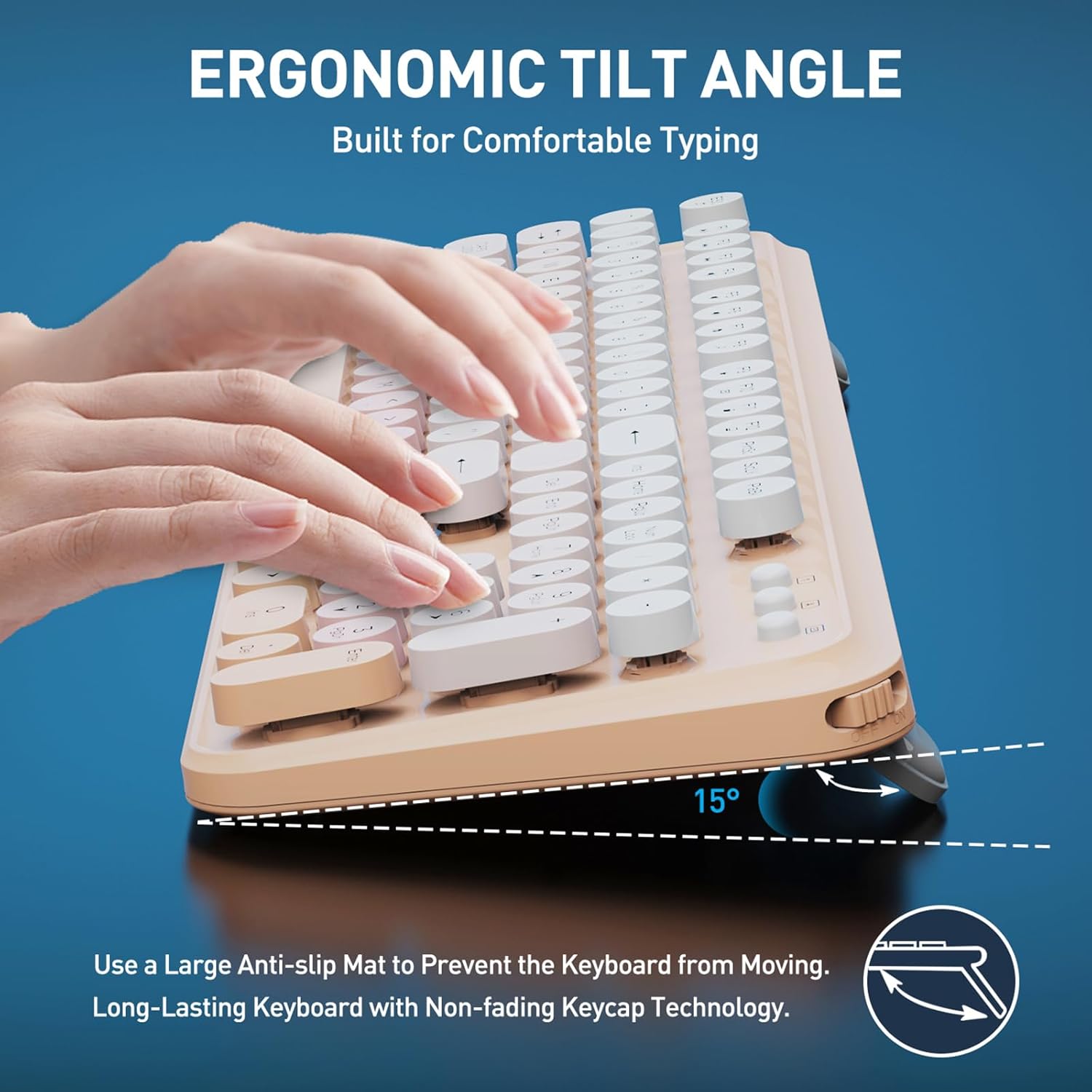 - 💞【Retro Round Keycaps & Silent Wireless Mouse】 keyboard and mouse wireless with vintage typewriter-inspired rounded keycaps, gives you the most comfortable typing experience and adds some much needed spunk to your desk.This cute mouse provides whisper-quiet clicking, don't worry about disturbing others, or causing unnecessary distracting noises.