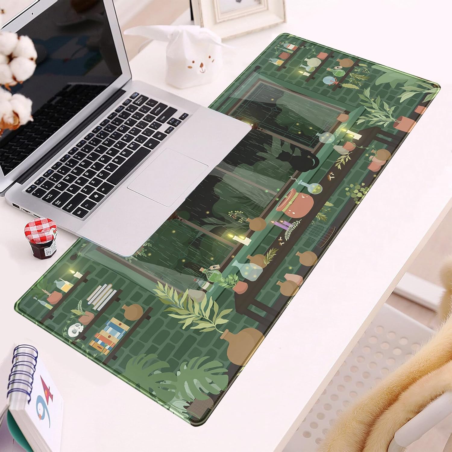 Kawaii Rainy Night Desk Mat Green Plants Gaming Mouse Pad XL, Aesthetic Anime Black Cat Desk Pad Laptop Computer Keyboard Mouse Mat, Desktop Decor Accessories for Girl Women Office 31.5"x11.8"