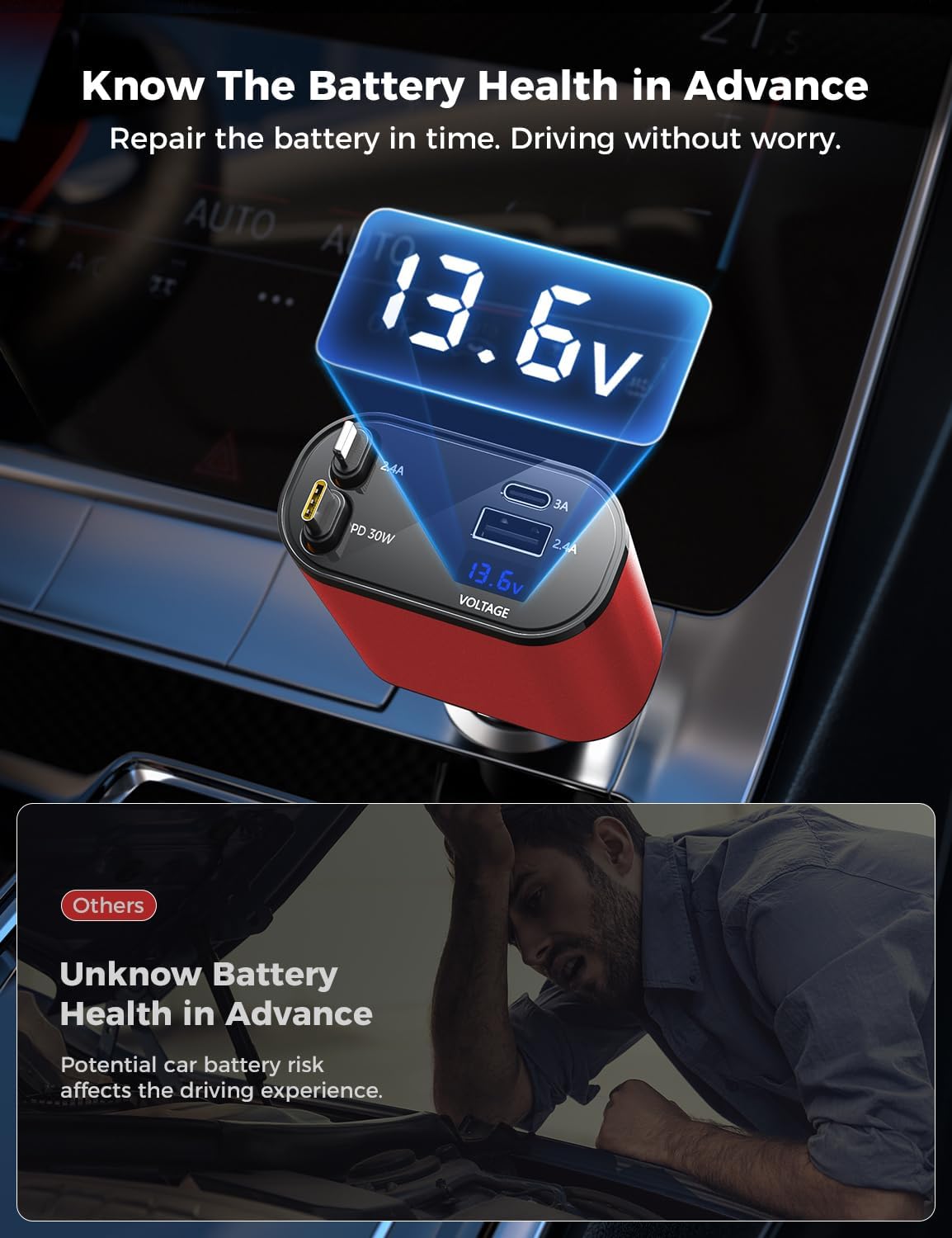 - Voltage Display for Battery Health Monitoring: Our Car Charger with cord is equipped with a voltage display feature, allowing you to monitor the health of your car battery at all times. Stay informed and ensure optimal performance for your vehicle.