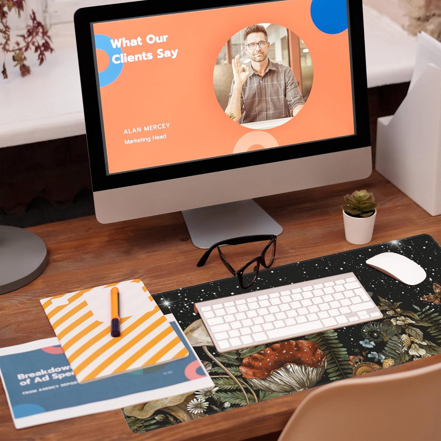 Large Gaming Mouse Pad for Desk,Cute Forest Mushroom Desk Mat,Starry Night Mushroom Desk Pad,Extended Big Computer Keyboard Mouse Pad with Non-Slip Base and Stitched Edge,31.5"x11.8"