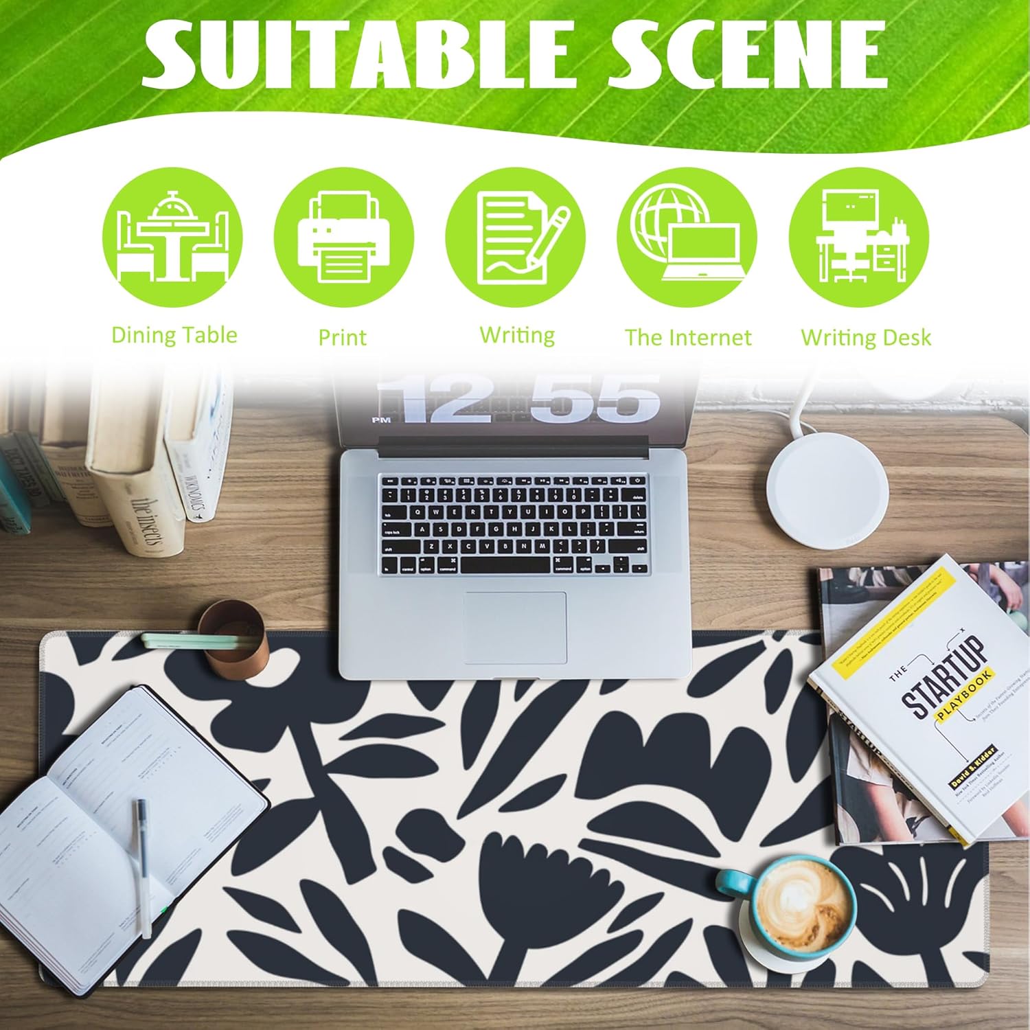 Desk Pad, Hand Drawn Leaves and Flowers Desk Mat, Abstract Plant Large Gaming Mouse Pad with Non-Slip Base and Stitched Edge, 31.5"x11.8"