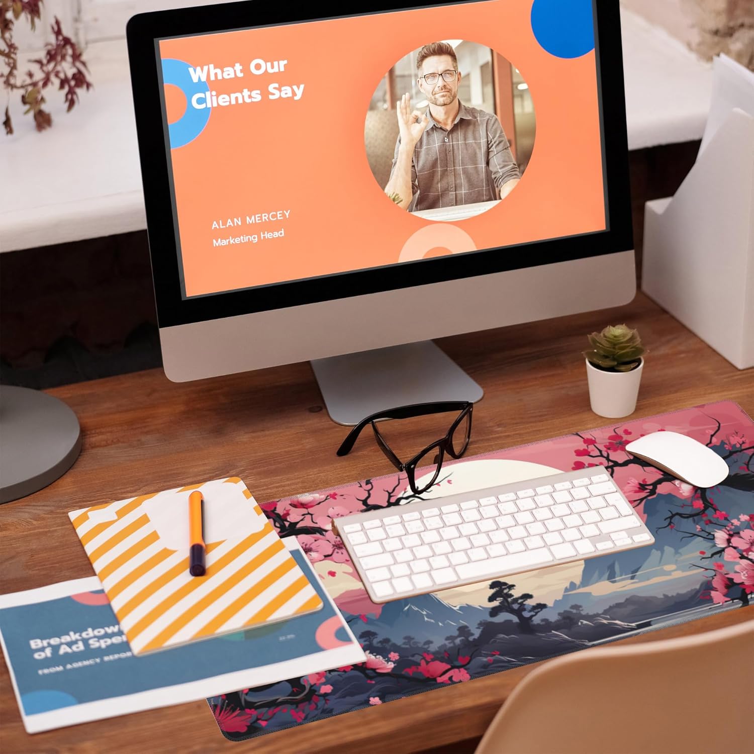 Pink Cherry Blossom Tree Desk Pad, Mountains and Sun Large Gaming Mouse Mat, Extended Big Computer Keyboard Pad With Non-Slip Base and Stitched Edge, 31.5"x11.8"