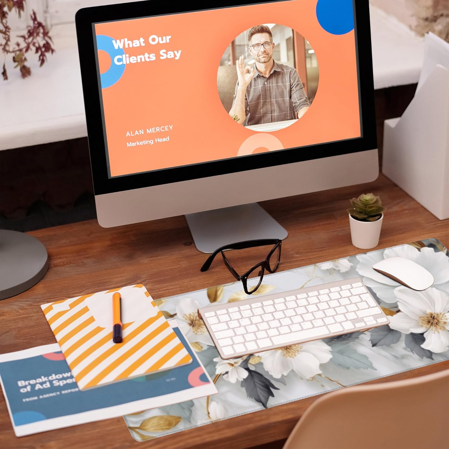 Desk Mat,White Gold Marble Desk Pad,White Flowers Golden Leaves Large Gaming Mouse Pad for Desk,Extended Big Computer Keyboard Mouse Pad with Non-Slip Base and Stitched Edge,31.5"x11.8"