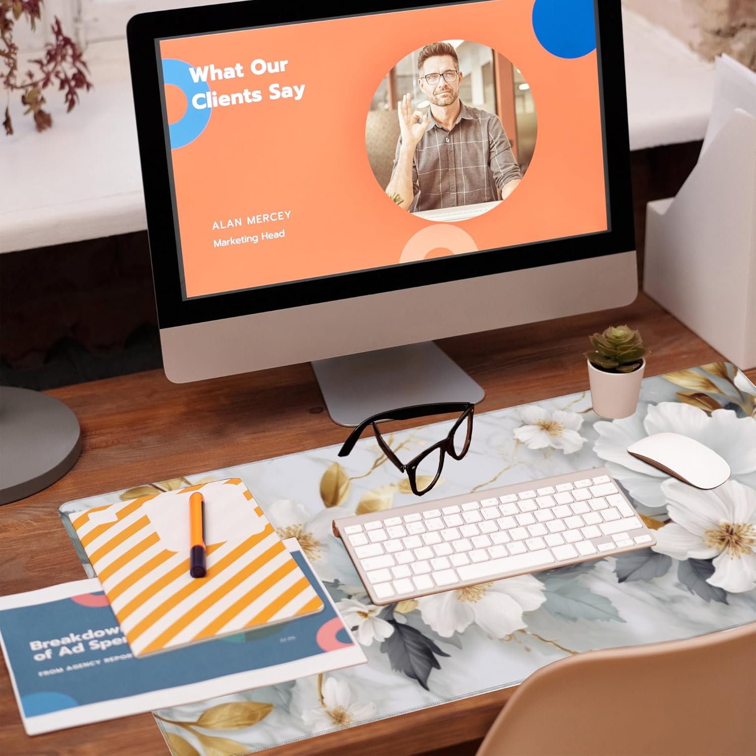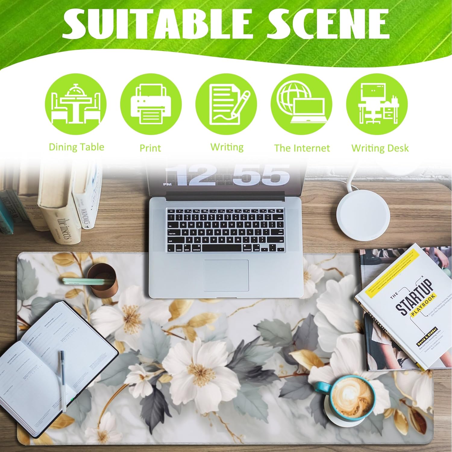 Desk Mat,White Gold Marble Desk Pad,White Flowers Golden Leaves Large Gaming Mouse Pad for Desk,Extended Big Computer Keyboard Mouse Pad with Non-Slip Base and Stitched Edge,35.4"x15.7"