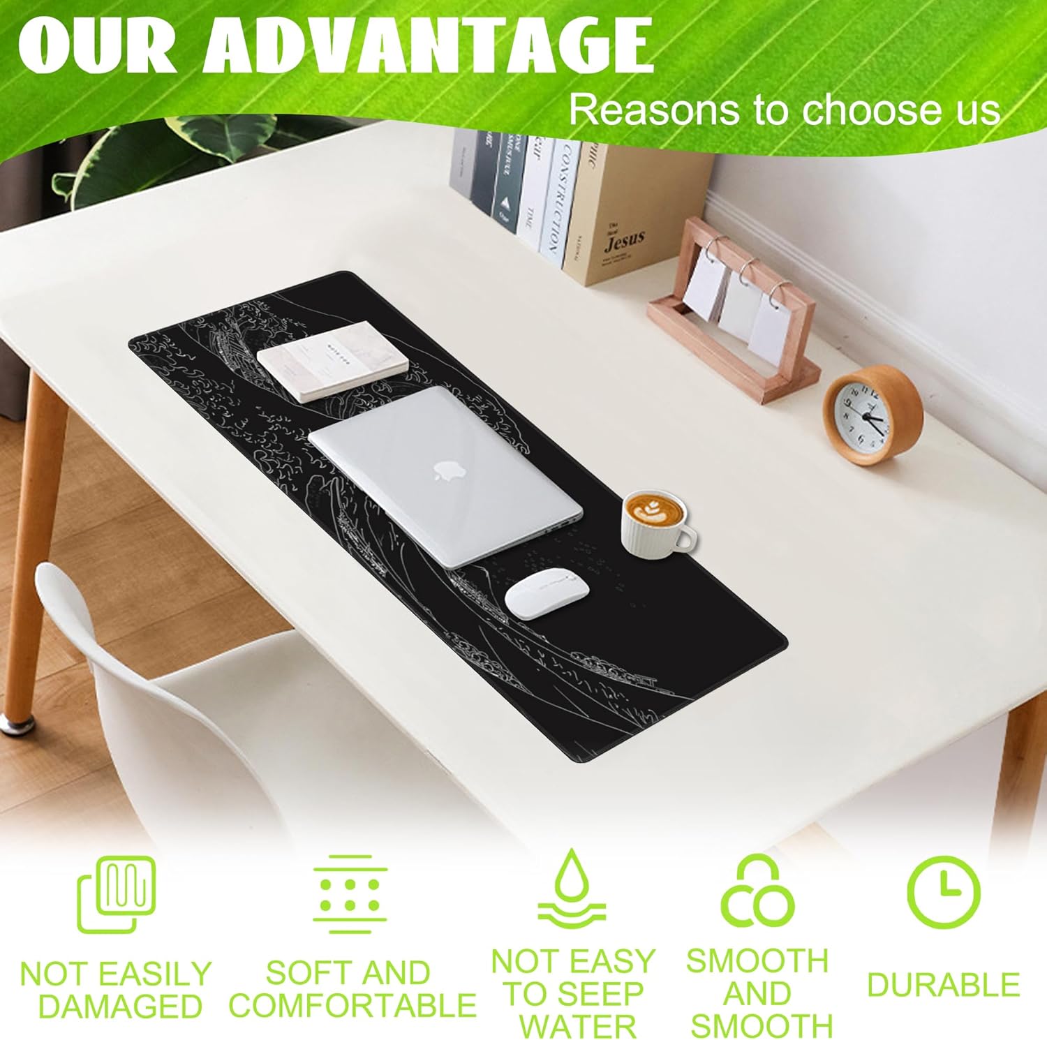 Desk Mat,Black Japanese Sea Wave Desk Pad,Japanese Sea Wave Large Gaming Mouse Pad for Desk,Extended Big Computer Keyboard Mouse Pad with Non-Slip Base and Stitched Edge,31.5"x11.8"