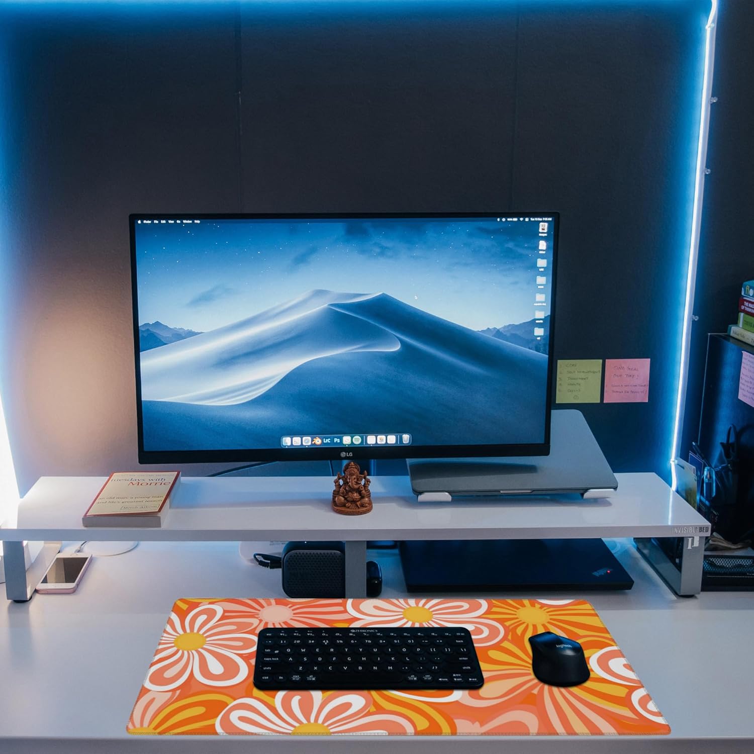 Desk Pad - Hippie Vintage Orange Flowers Desk Mat, Retro Floral Large Gaming Mouse Pad with Non-Slip Base and Stitched Edge, 31.5"x11.8"