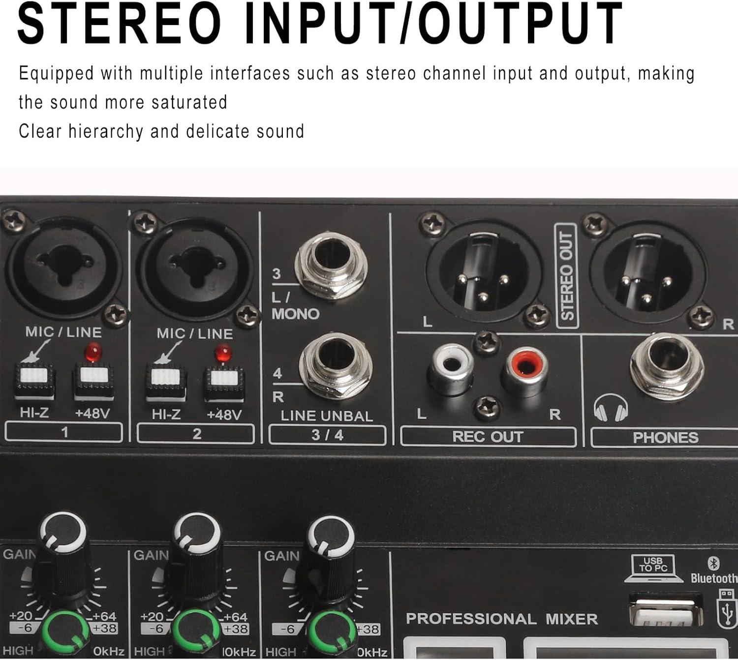Dj Mixers, 4 Channel Audio Mixer, Sound Board with Bluetooth Player, Usb Audio Interface with 48V Phantom Power, Sounds Mixer Board with 99 DSP FX Reverb Delay Effect