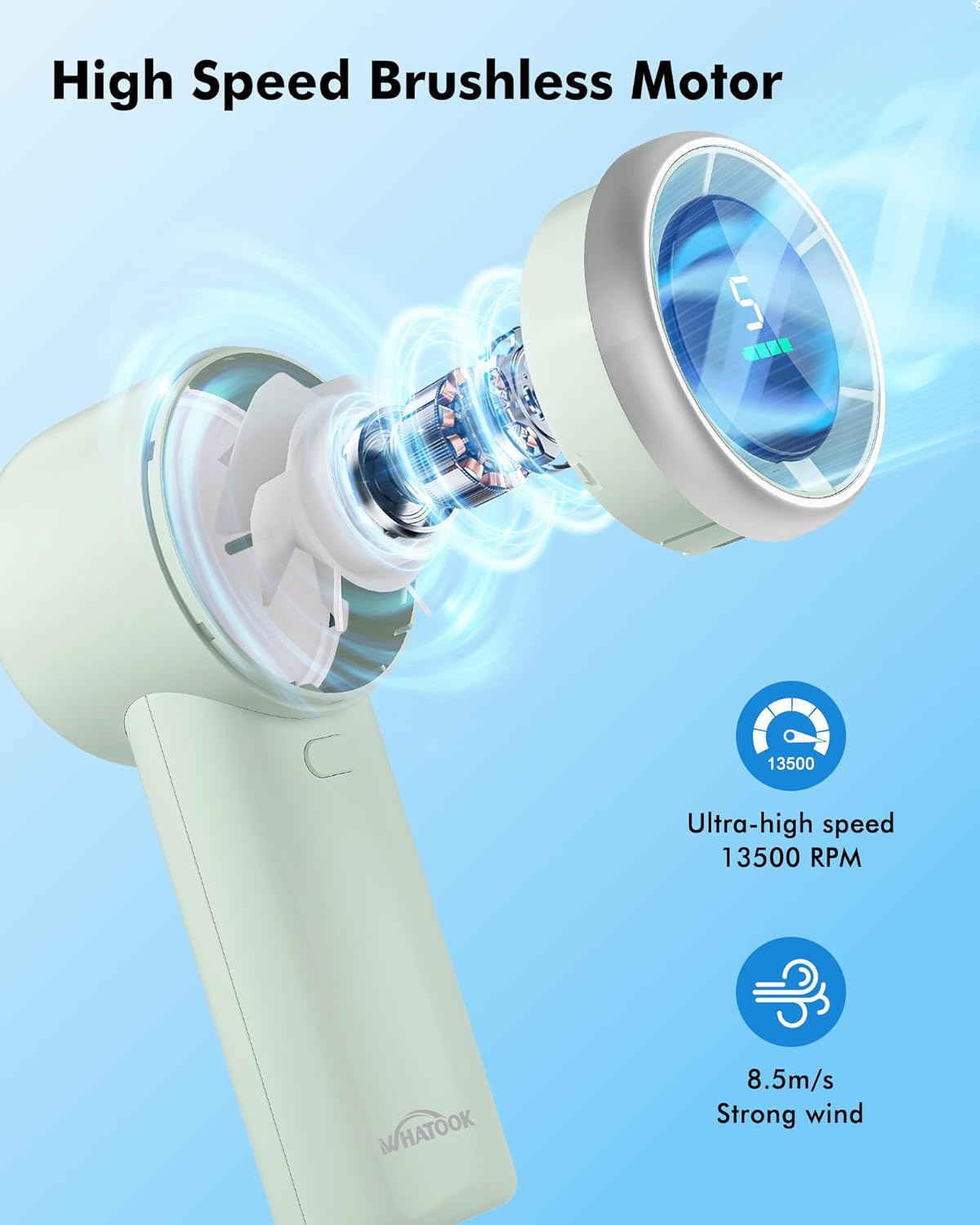 - SUPER FAST SPEED: Adopting brushless motor, the speed is up to 13,500RPM per minute, super high speed brings cooler wind experience