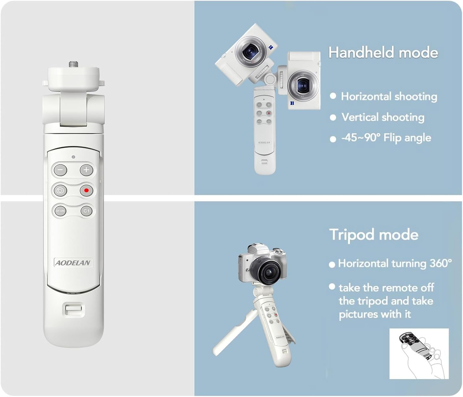 - AODELAN Tripod Grip with Remote Control can be used either as wireless shooting grip and tabletop tripod (hold up to 1 kg (2.2 lb) weight of camera). Light weight and easy to carry. Ideal for vlogging and live streaming and selfie