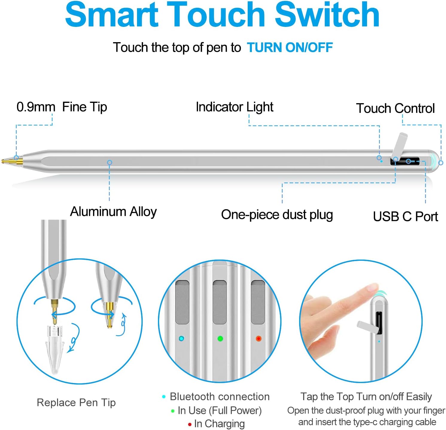 - 【Touch Switch & Fast Charging】Turn on this stylus pen by simply touching the cap button.With Type-C USB cable supports 8-10 h continuous use only need 14 minutes charging time.Stylus pen with palm rejection technology provides a natural writing feeling and quick, effortless interaction with your screen, gives you more accuracy and control against the screen. We commend you to use this pen on the iPad with a glass screen protector.
